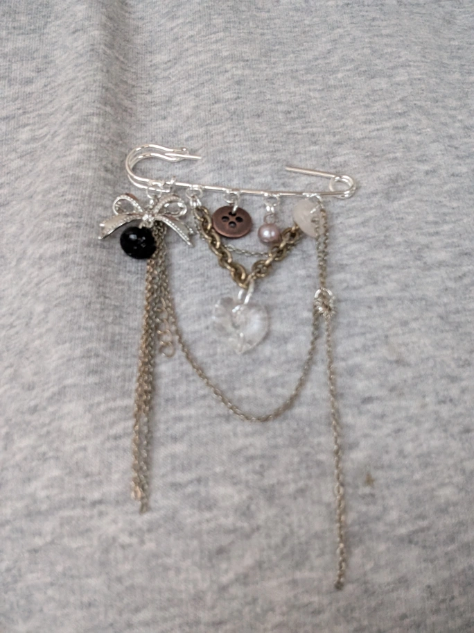 Silver tone safety pin brooch. Features multiple chains, buttons, beads, and a crystal heart. Great statement piece.