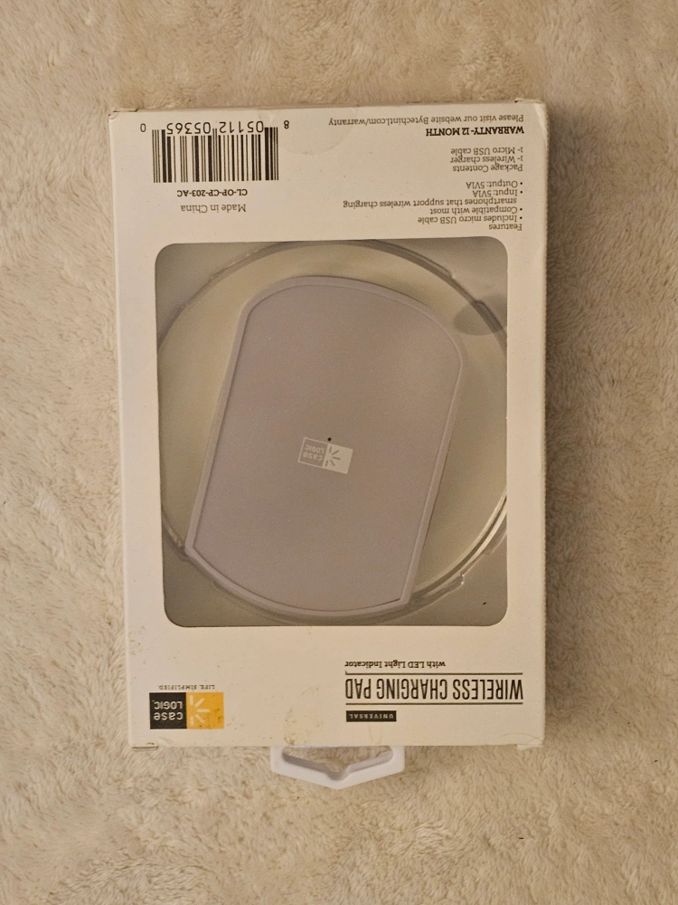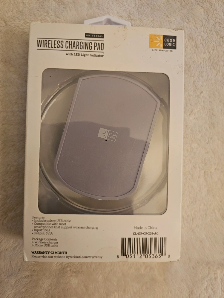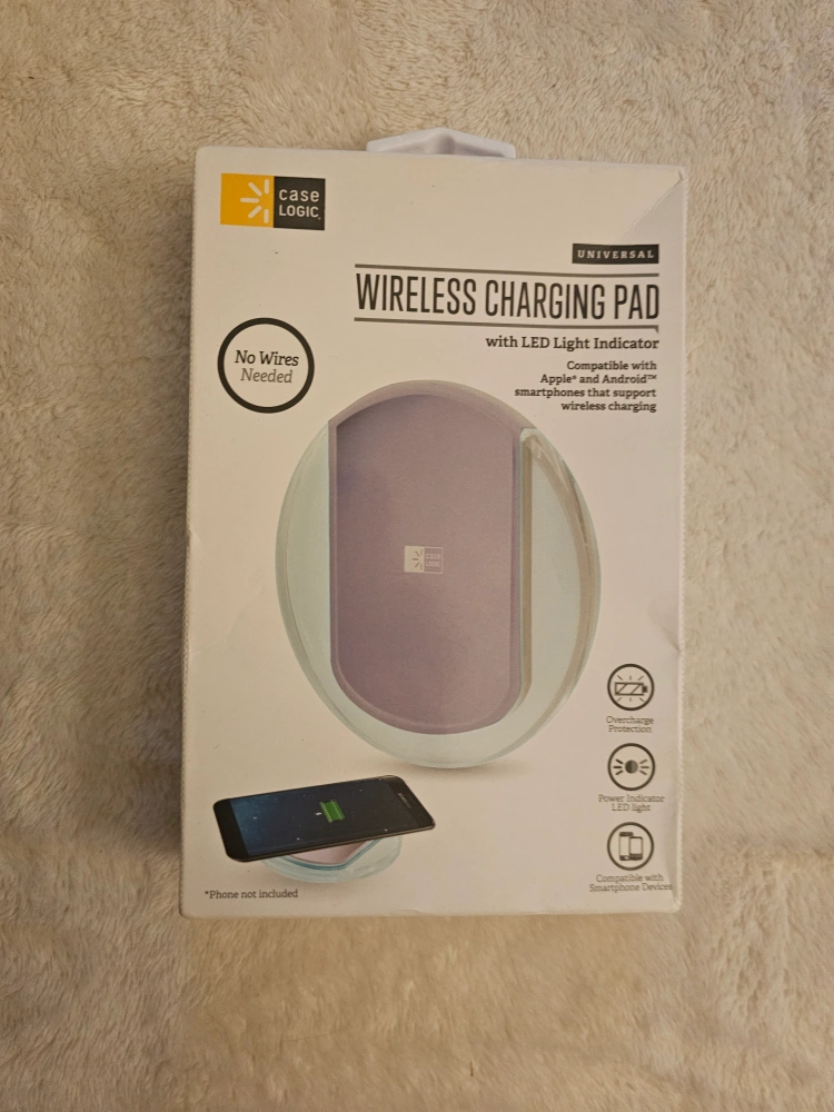 Universal wireless charging pad. LED light indicator. Compatible with Apple and Android smartphones that support wireless charging. Includes micro USB cable. New, in original packaging.