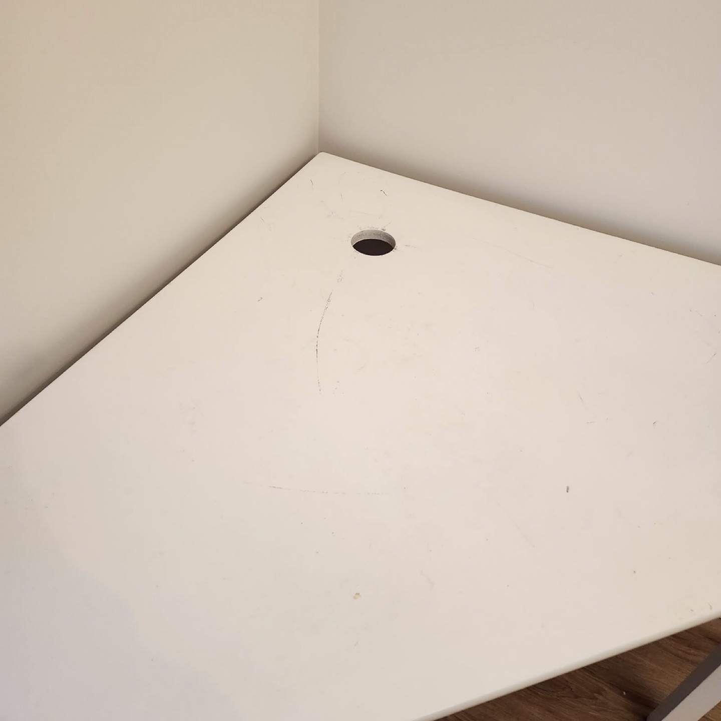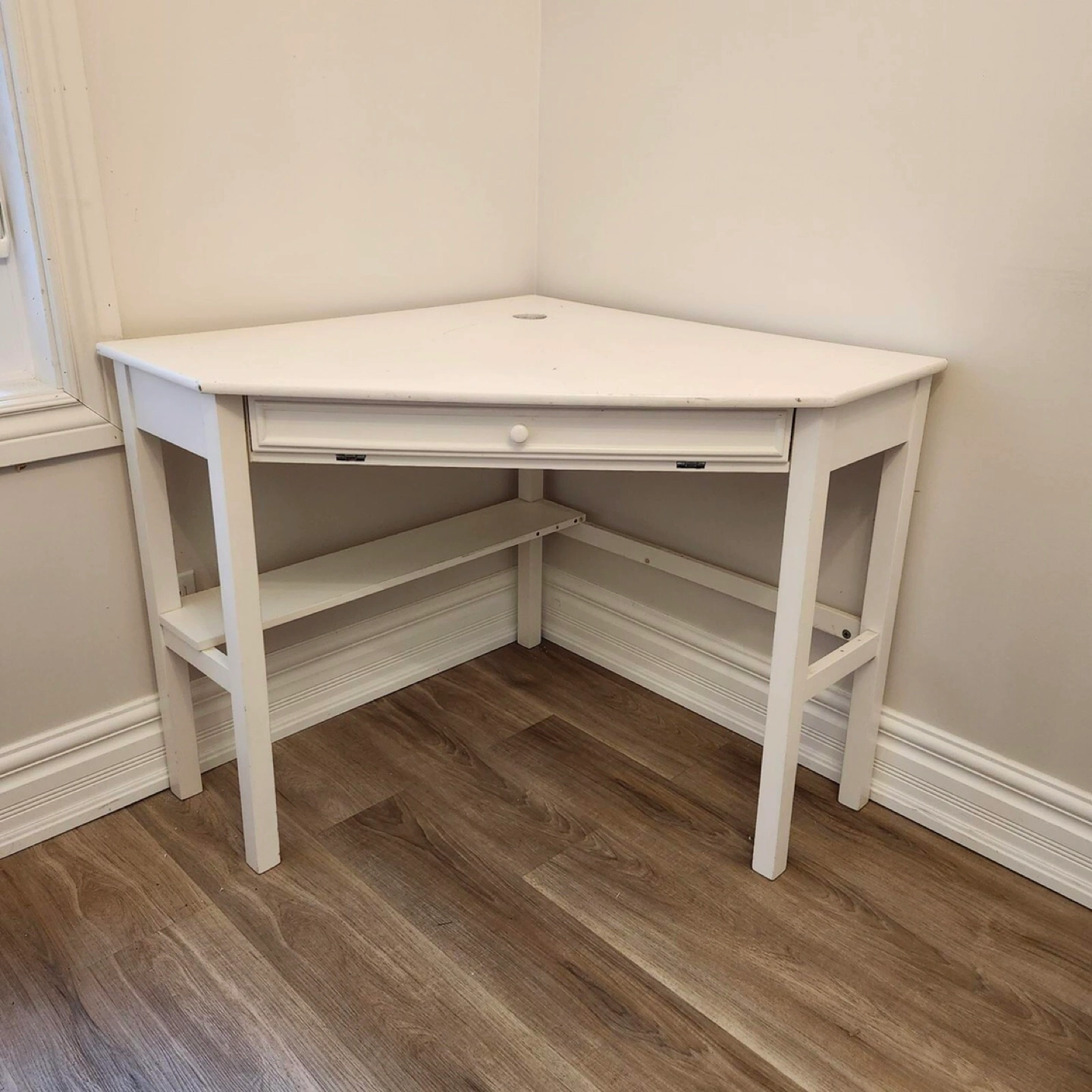 Corner desk, white finish. Features a pull-out keyboard tray and lower shelf. Some minor wear and tear.
