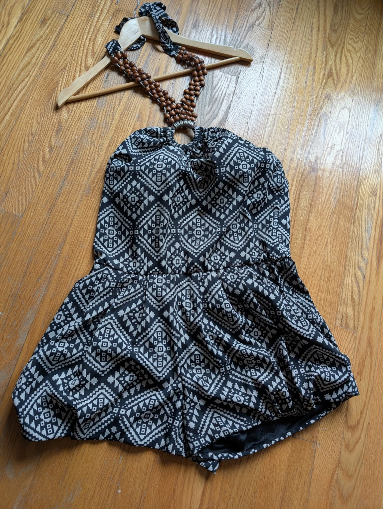 Cute black and beige romper. Features an aztec print and wooden bead halter neck. Perfect for summer. With pockets!