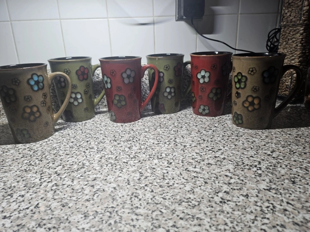 Six ceramic mugs. Tall mugs feature colourful floral pattern. Various colours including pale green, forest green and maroon. dishwasher and microwave safe.