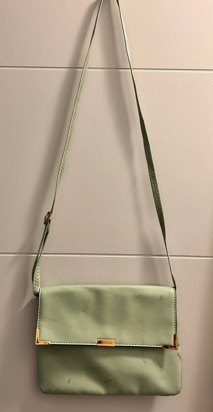 Lightly used Caprese crossbody bag. Pale green colour. Features gold-toned hardware. Adjustable strap. Interior zippered pocket. Flap closure.