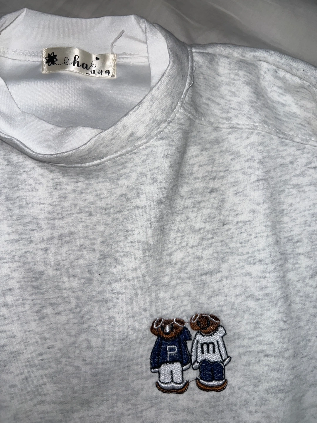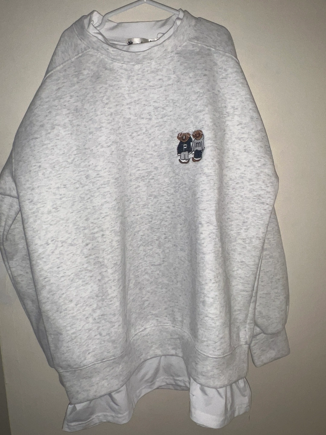 Cute grey heathered crewneck sweatshirt. Features a small embroidered design of two bears. Layered look with a white mock neck underneath. Long sleeves, relaxed fit.