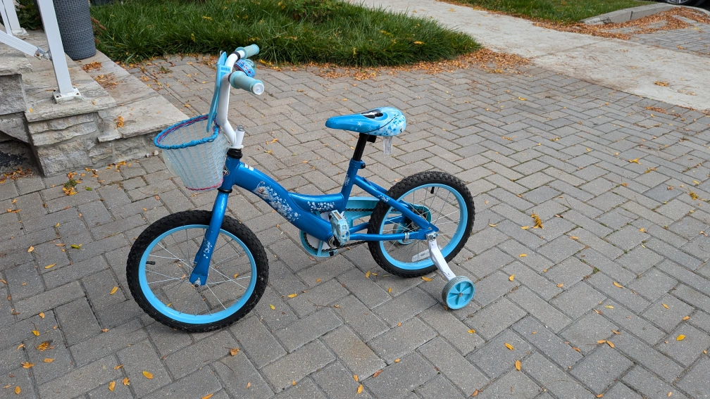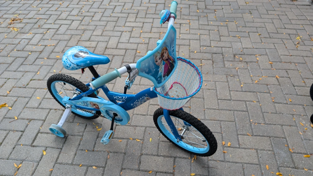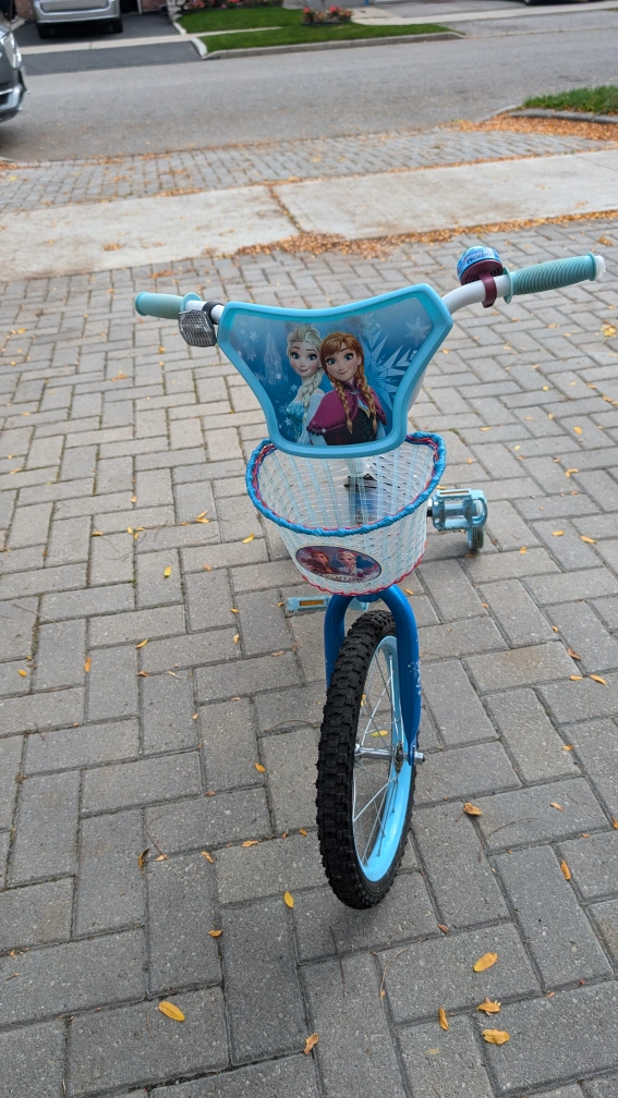 23Girls' bike, blue with Frozen design. Includes training wheels and front basket. Suitable for younger children.