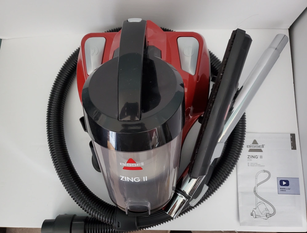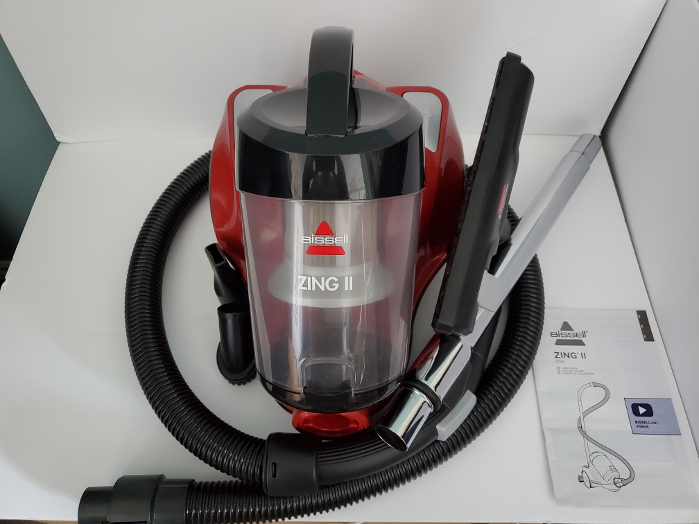 -Red and black canister vacuum -Includes attachments and instruction manual