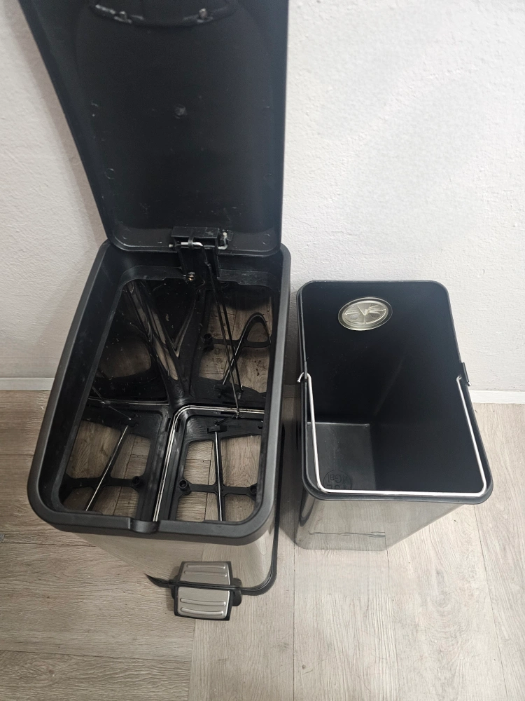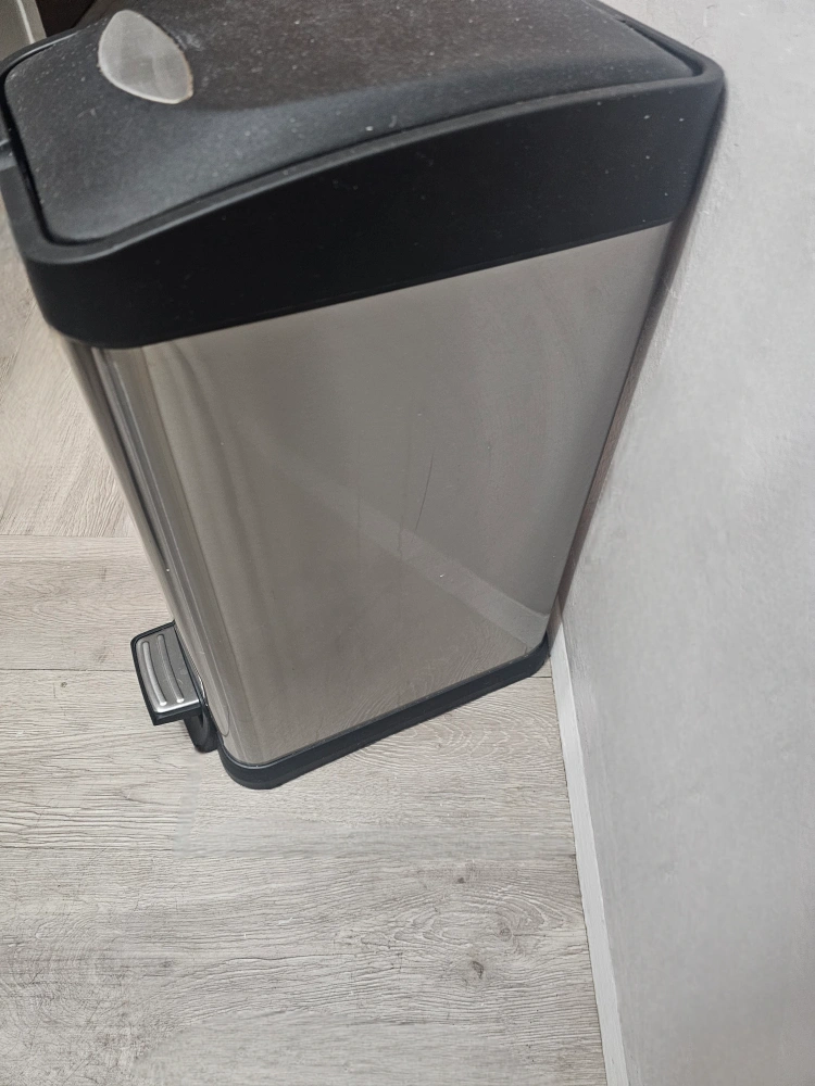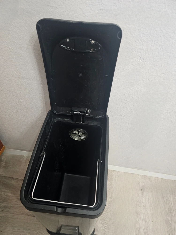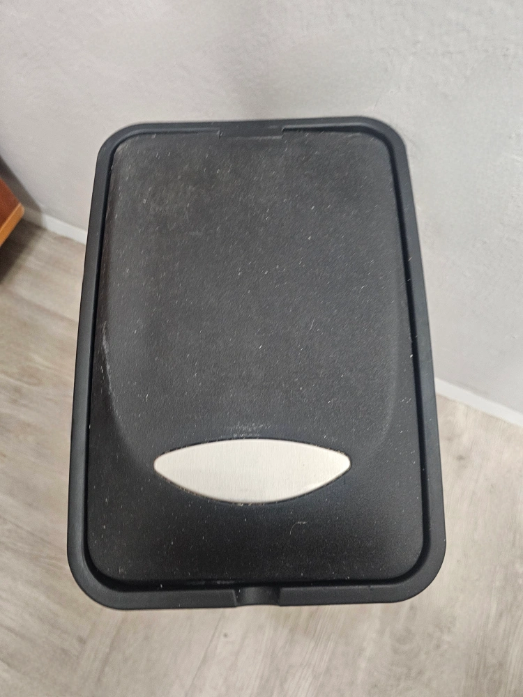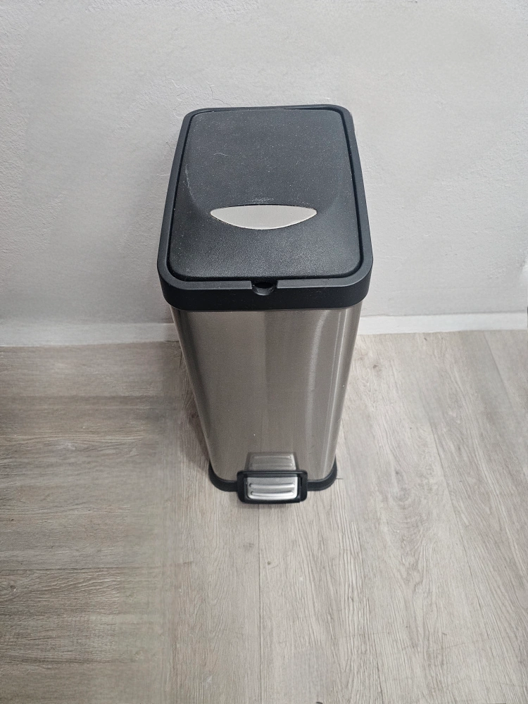 Step on trash can. Stainless steel body. Black plastic lid basket. Foot pedal operation. Pre-owned in good condition, other then inside has some rust from using beach from regular cleanings overtime. Which you don't see with the inner basket in. Some minor normal wear. Otherwise all good!