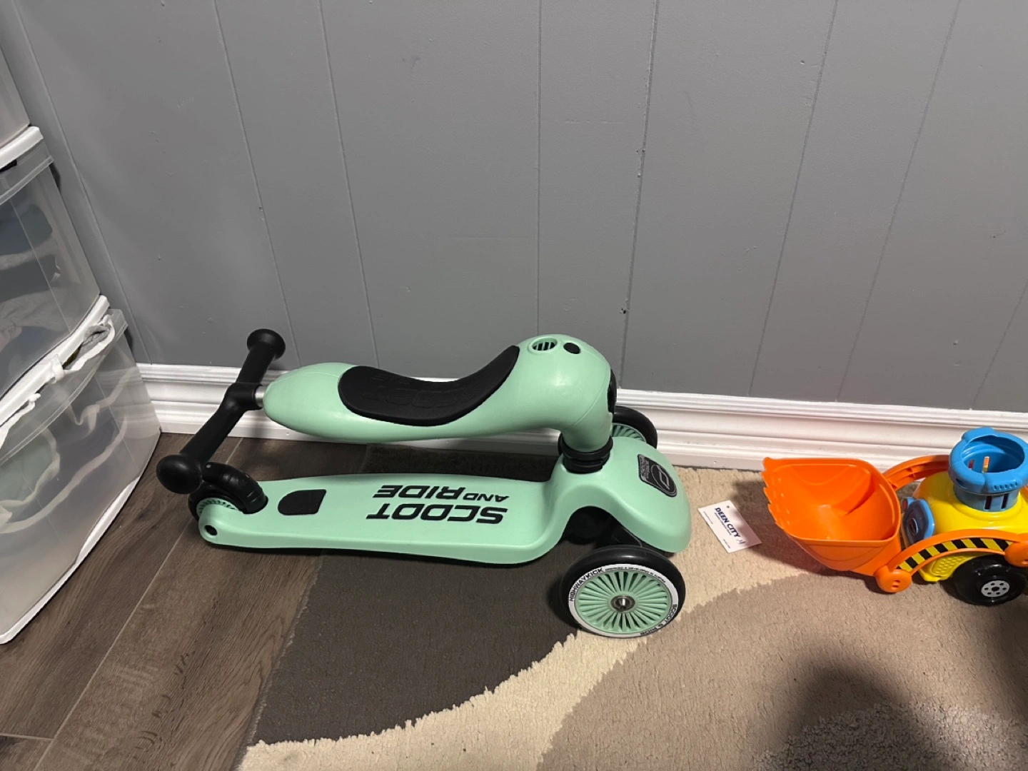 Lightly used children's scooter. Suitable for toddlers and young children. Converts from a scooter to a ride-on. Mint green colour.
