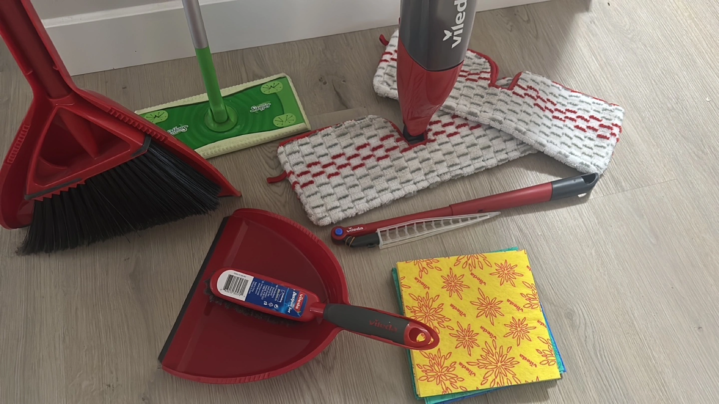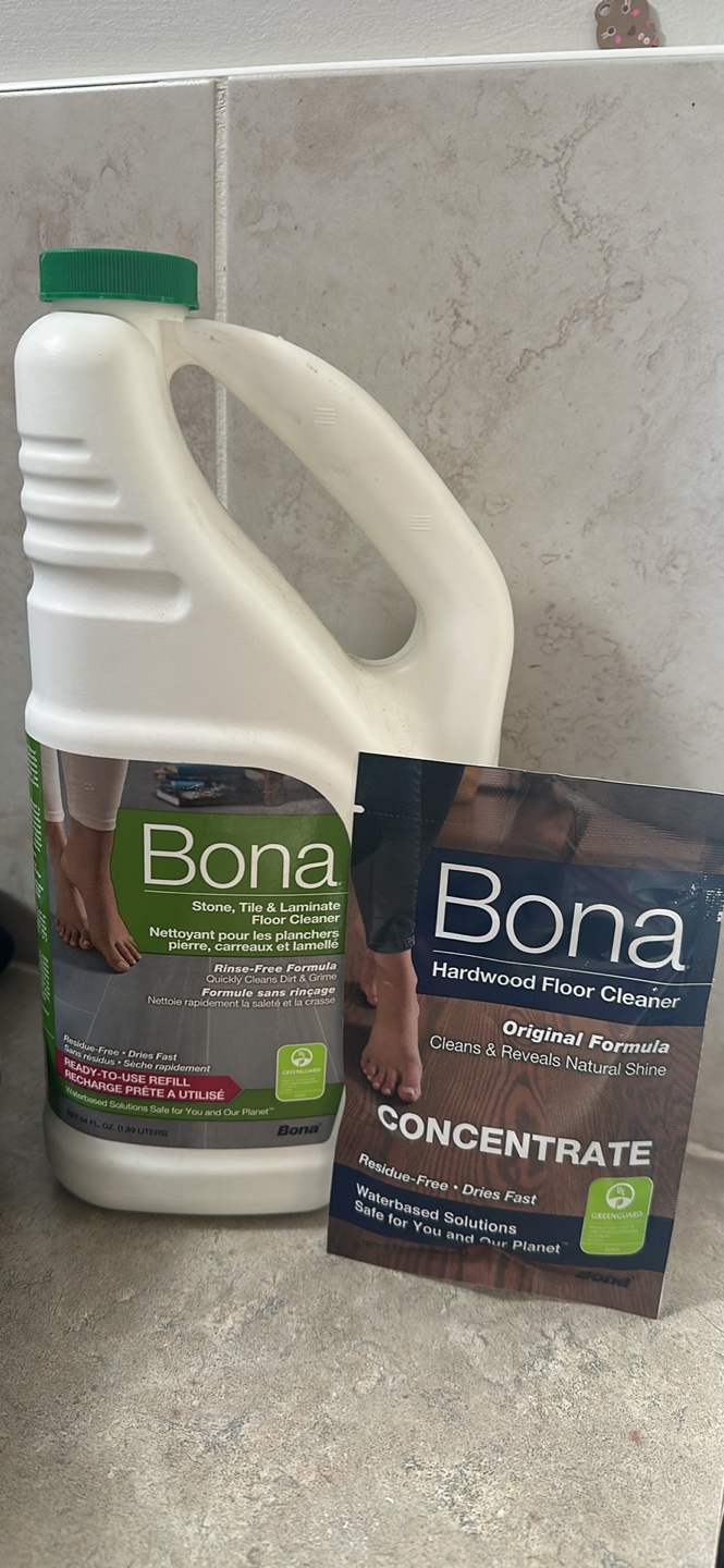 Cleaning kit includes Vileda mop with two cloths, four microfiber cloths, dustpan, and brush. Bona hardwood floor cleaner concentrate included and half bottle of stone and tile. Great for quick and easy cleaning.
