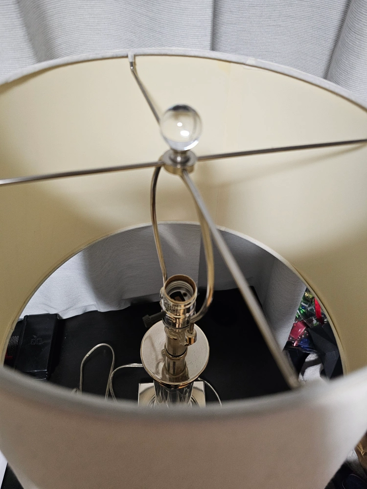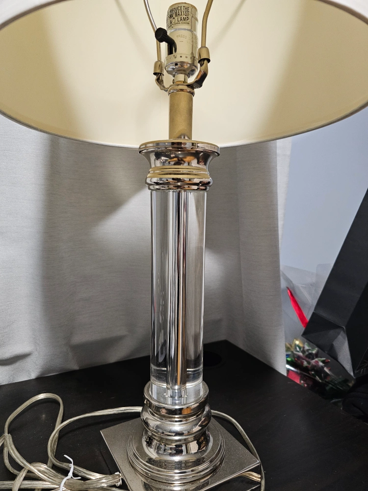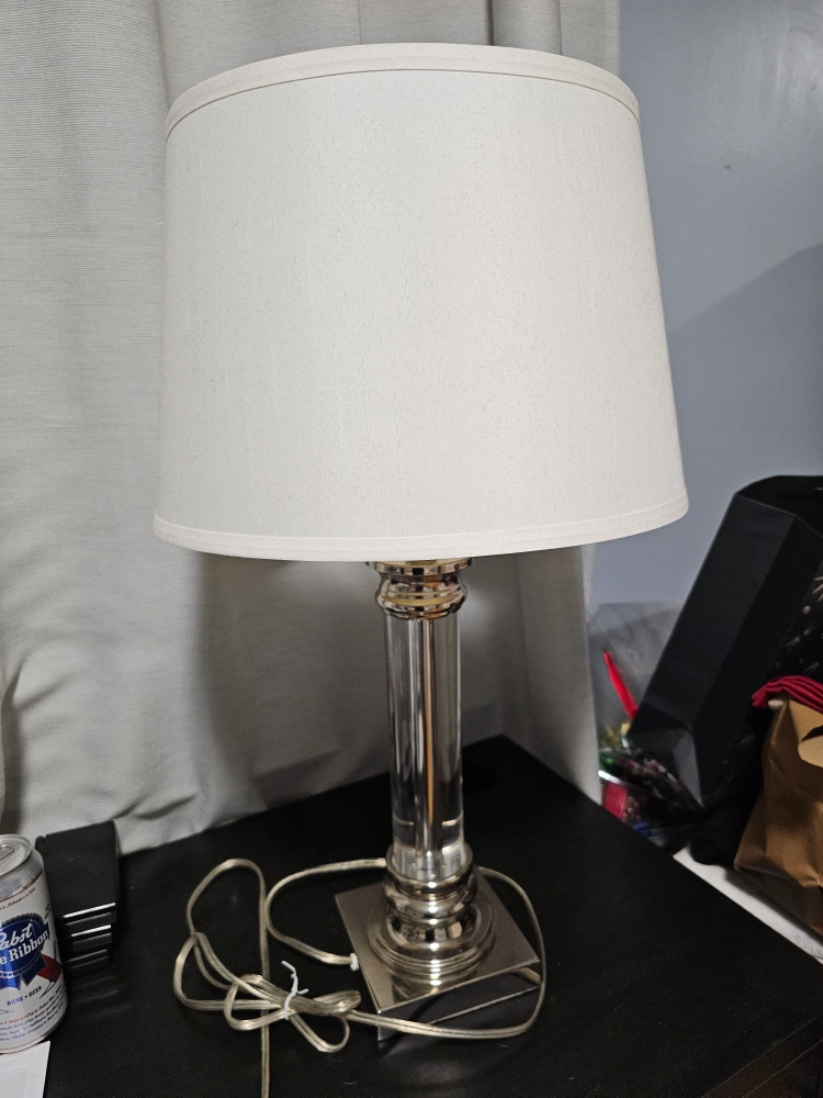 Set of 2 Beautiful table lamp. Features a clear crystal column & a brushed nickel-tone base & accents. Off-white drum shade included. Excellent addition to any room. Used but in great condition. Pick up only.