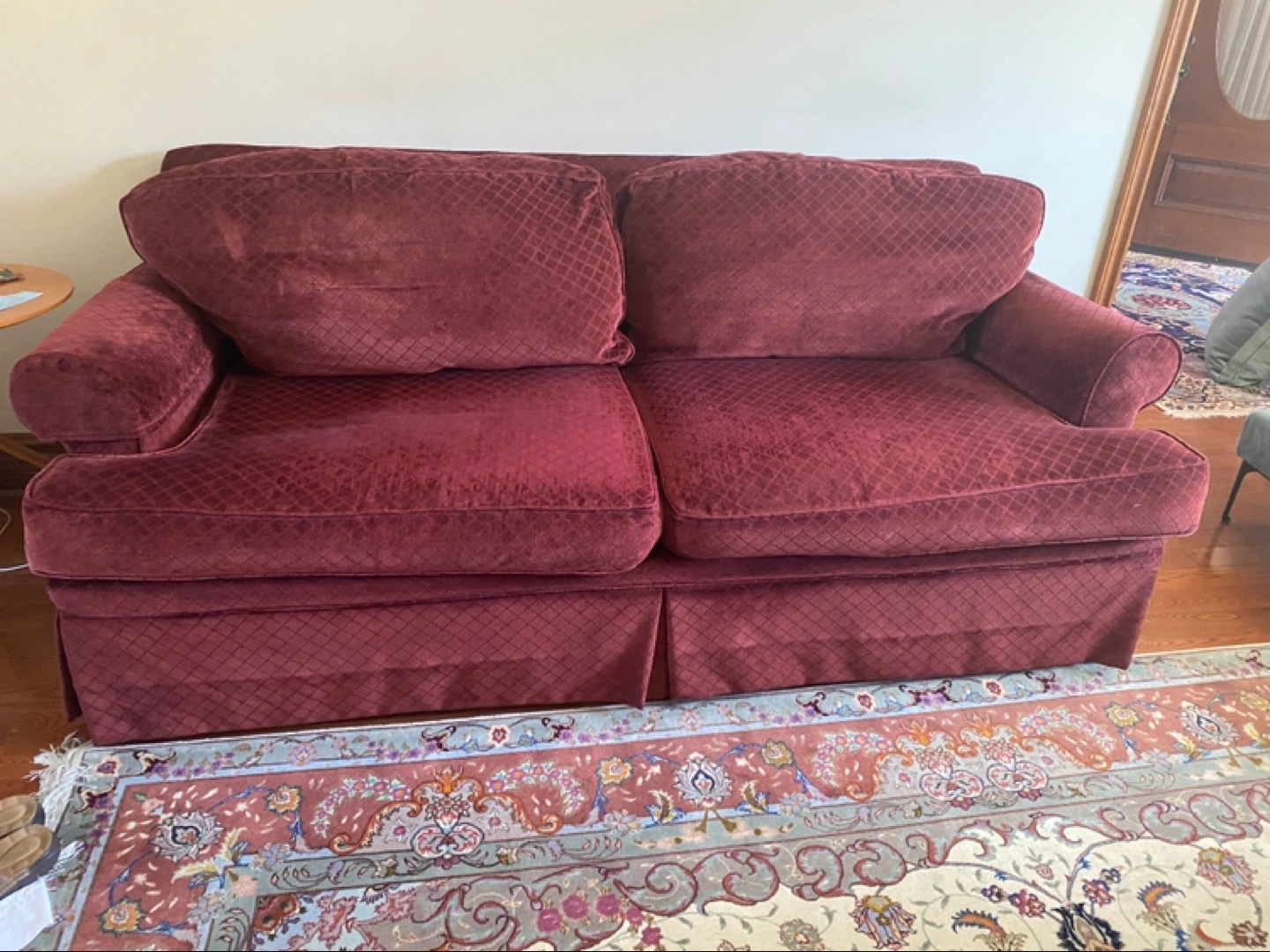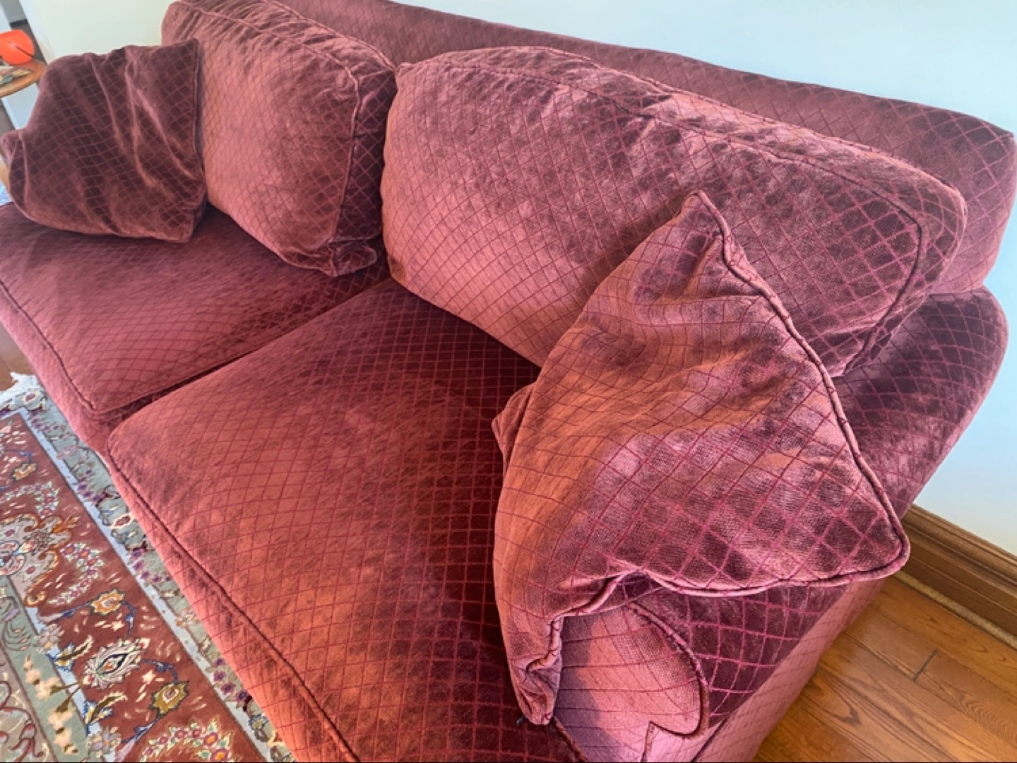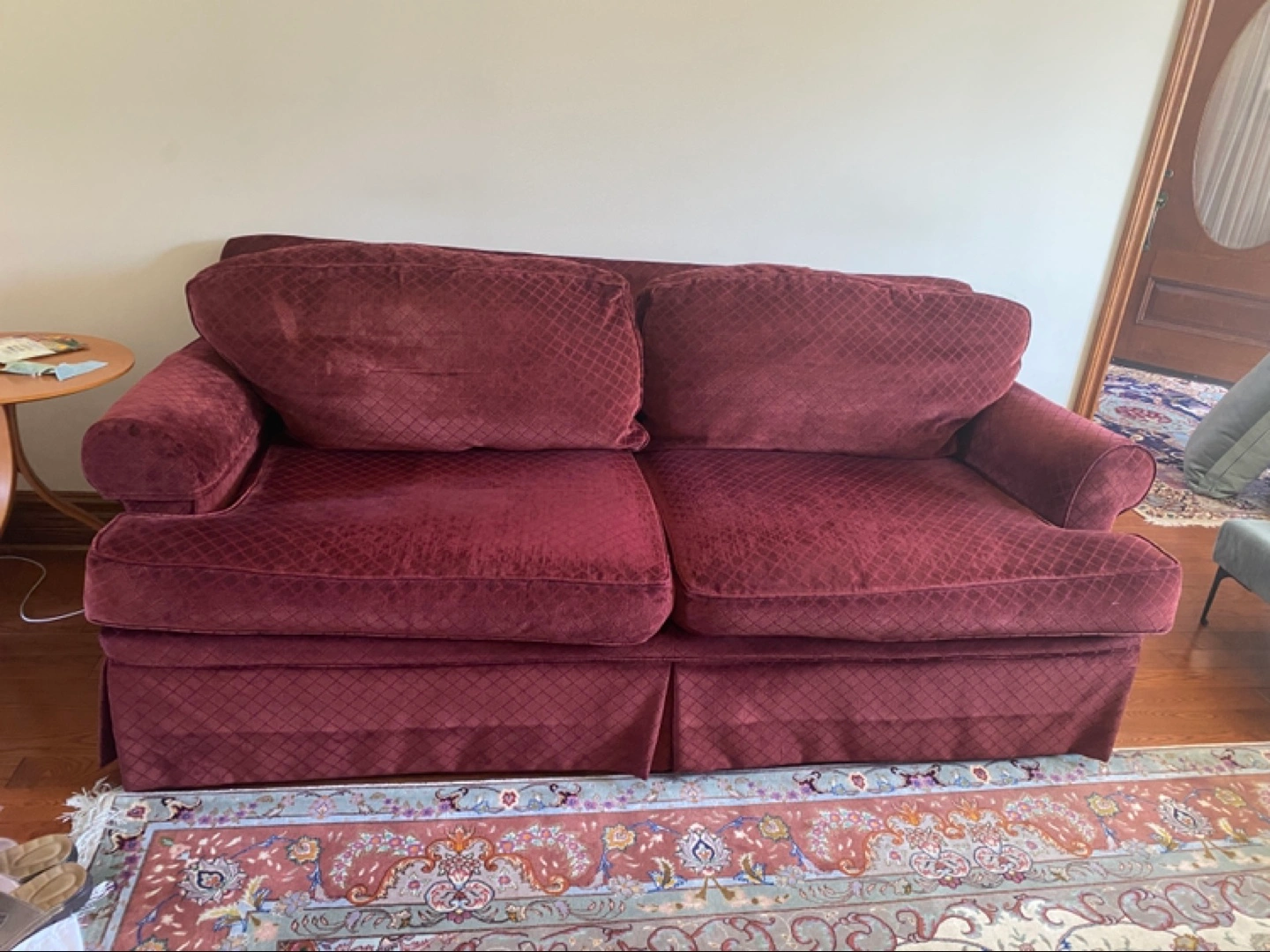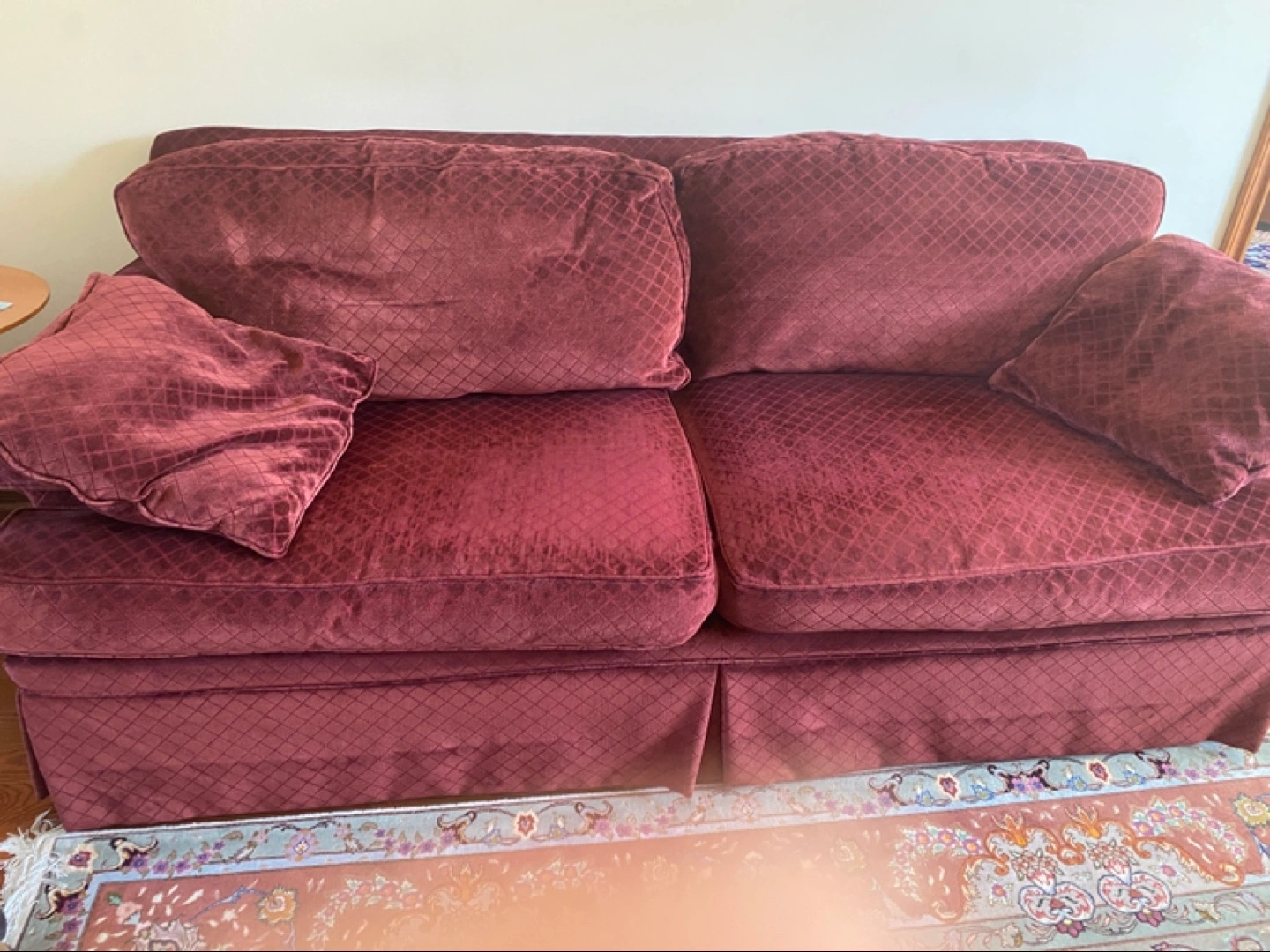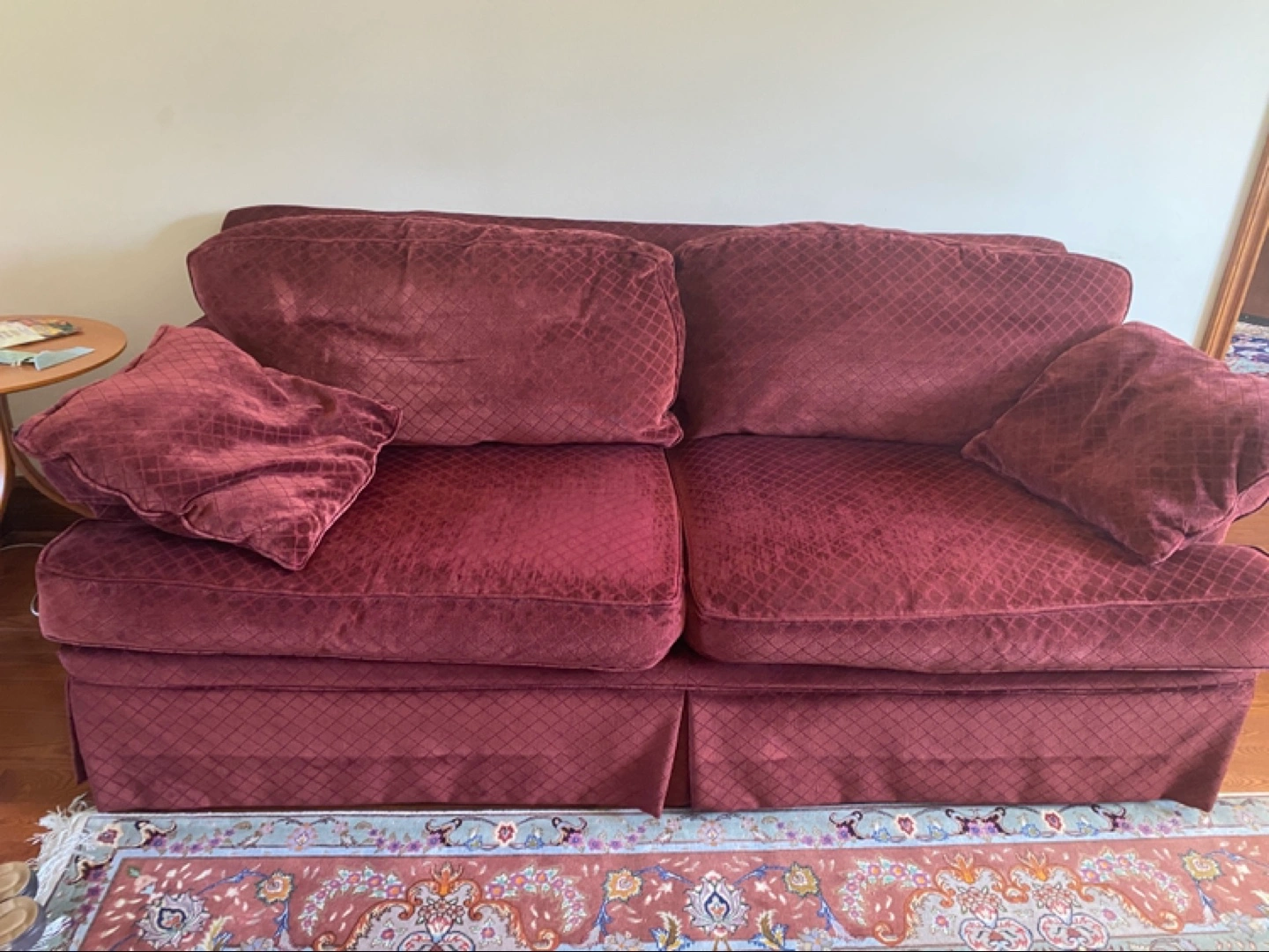 Dark burgundy velvet sofa, bought from the Bay, very good quality. Features rolled arms and a pleated skirt. Includes two matching throw pillows. Good used condition. Super clean. Very comfortable. Take all offer.