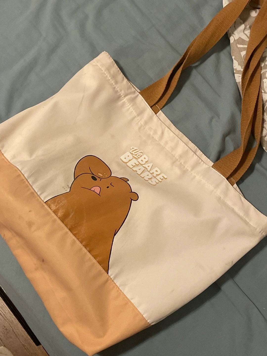 Adorable We Bare Bears tote bag. Features a zipper closure and brown straps. Great for shopping or carrying everyday essentials. Slight discoloration visible.
