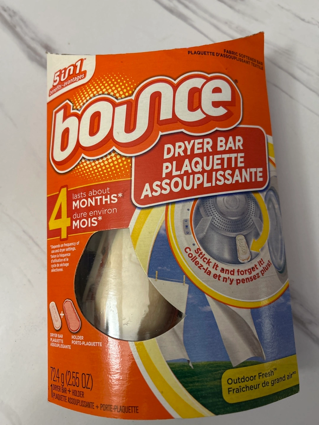 New Bounce dryer bar, Outdoor Fresh scent. Includes holder. Lasts approximately four months.