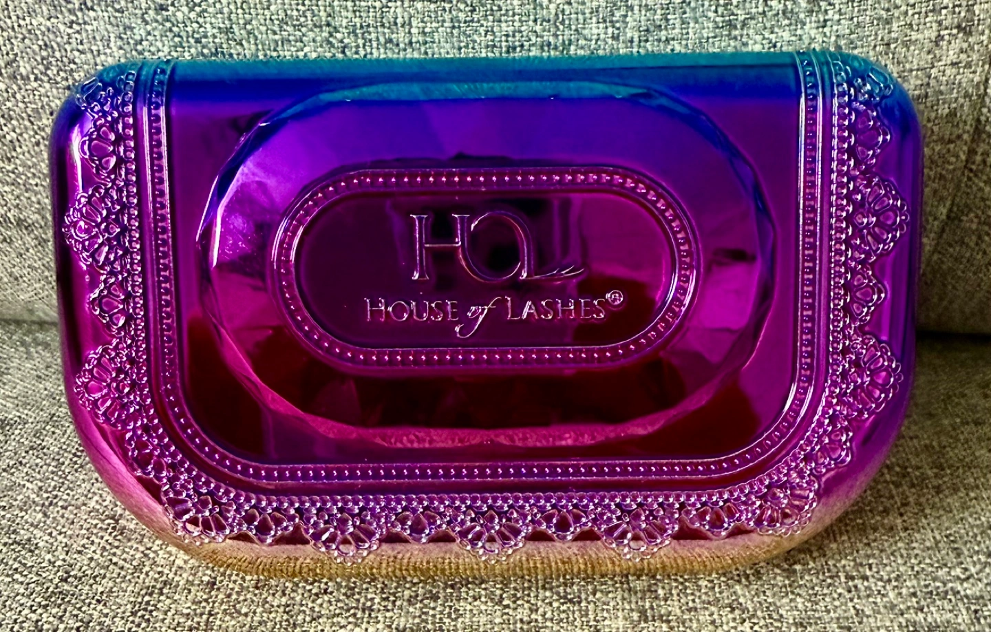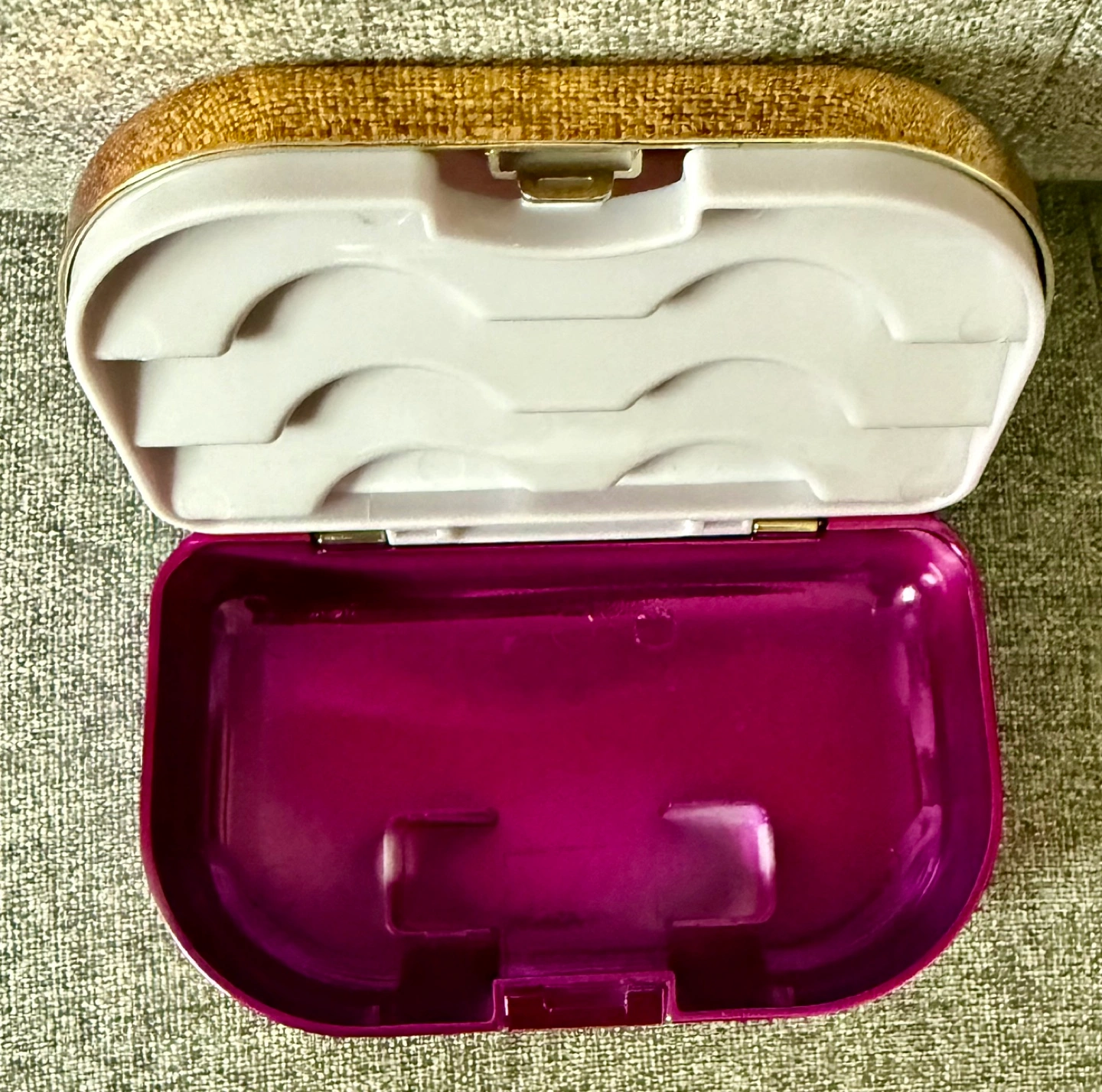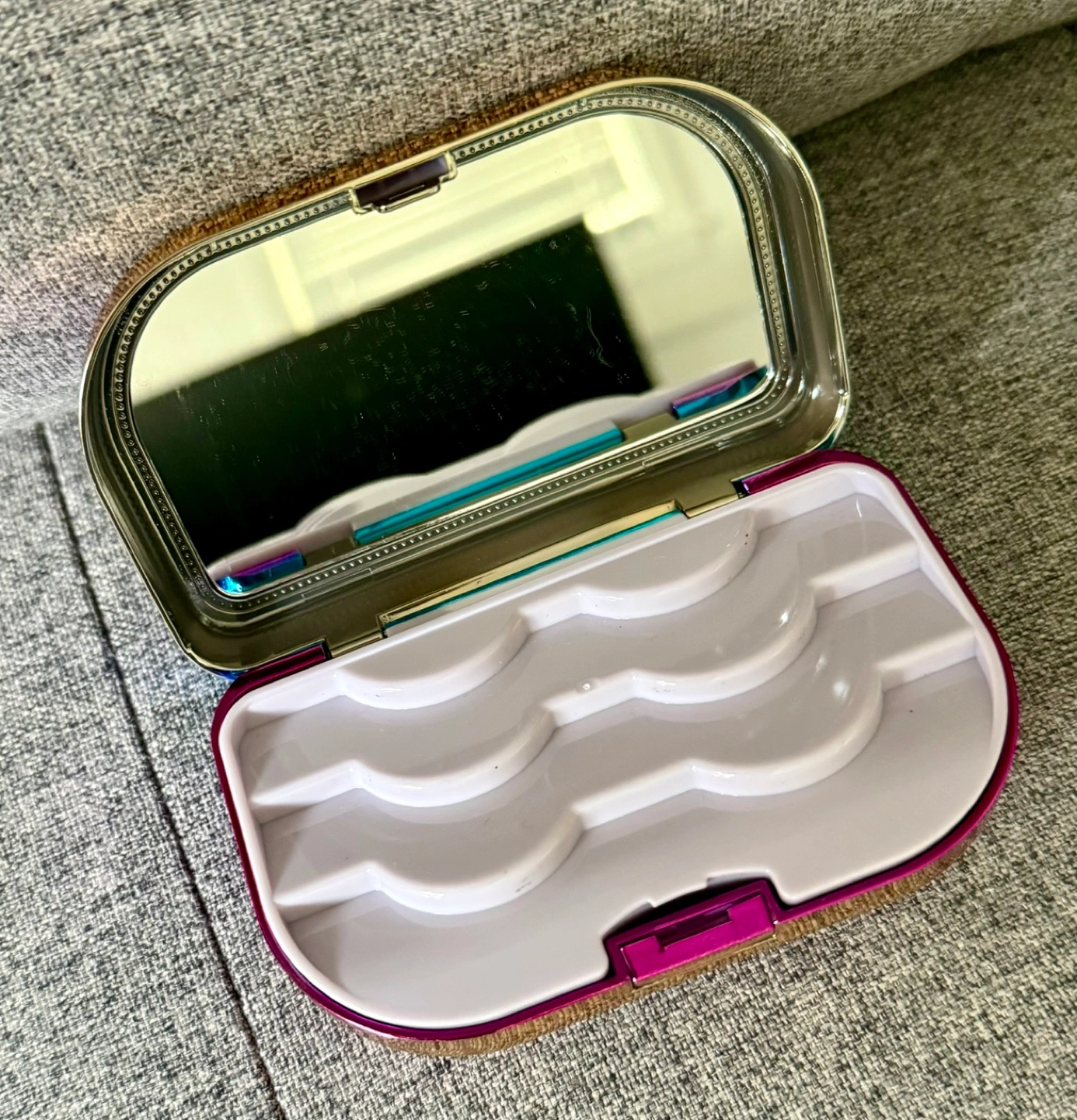 Portable case for storing false eyelashes. Features a mirror and lift up tray to store lash glue etc. Compact and convenient design. Holds up to 3 pairs of lashes. Purple and gold colour scheme. 2 available