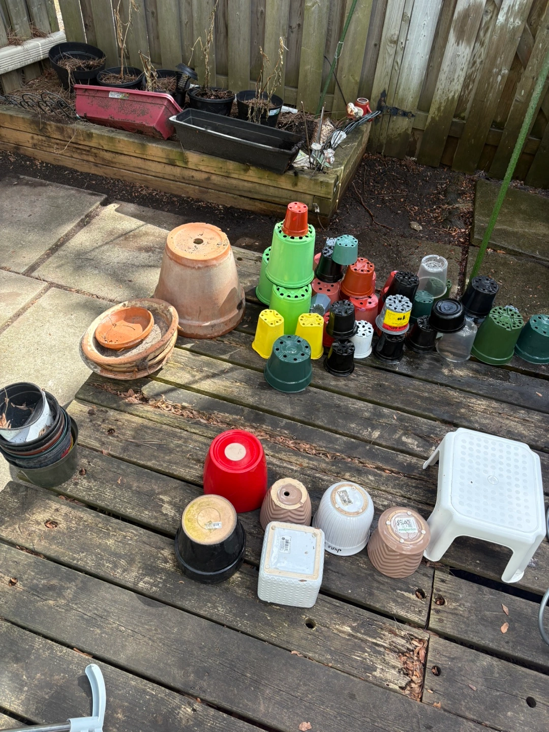 Collection of various sized pots and planters. Includes terracotta, plastic, and ceramic options. Great for gardening enthusiasts. Some pots are stacked. XS - .25¢ S- $1 M- $1.50 Ceramic $2 Minimum of 10 piece to buy