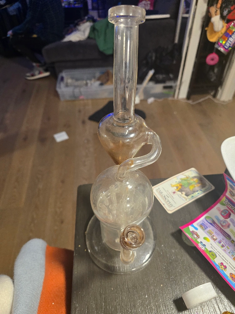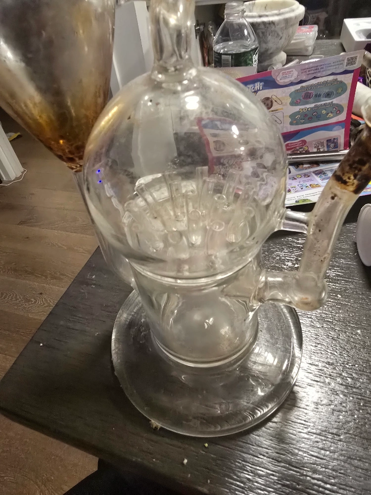 Multi-chambered glass water pipe. Used condition. Shows some staining. Good for smoking. can't find the bowl.