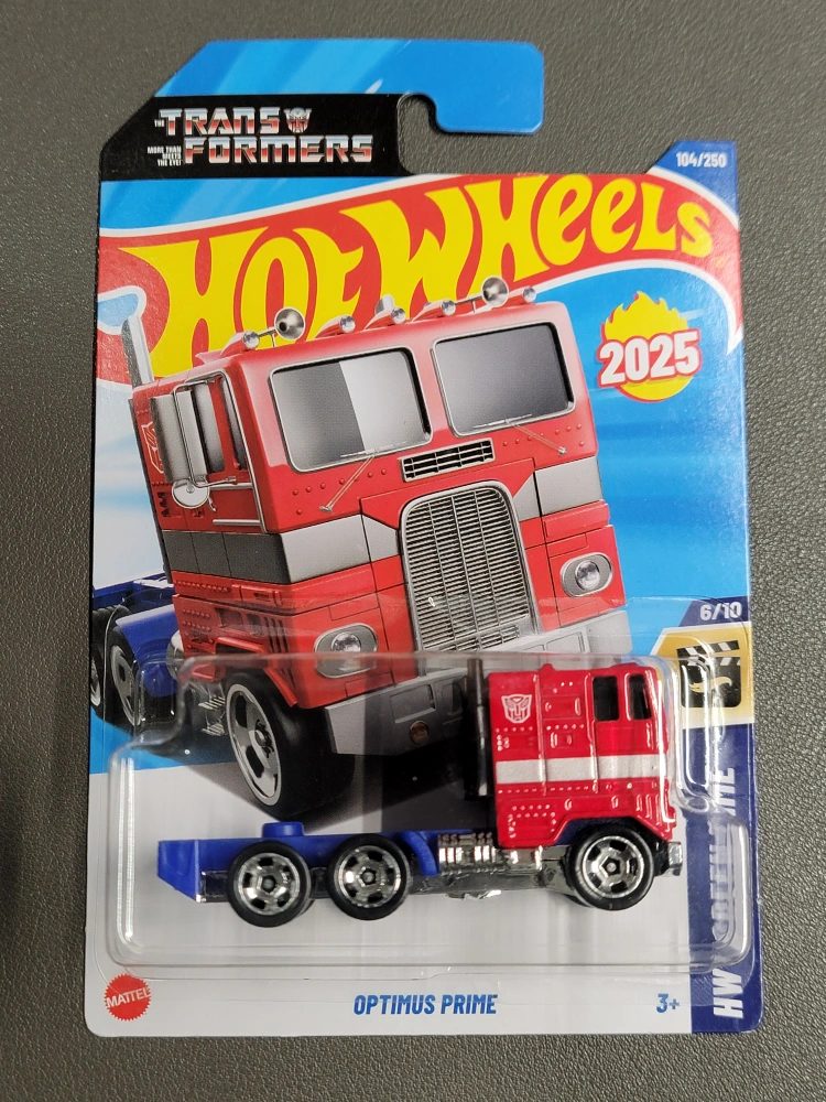 52Hot Wheels Optimus Prime diecast car. Part of the 2025 series. Number 6 of 10. Collectible item. In original packaging. Got multiple.