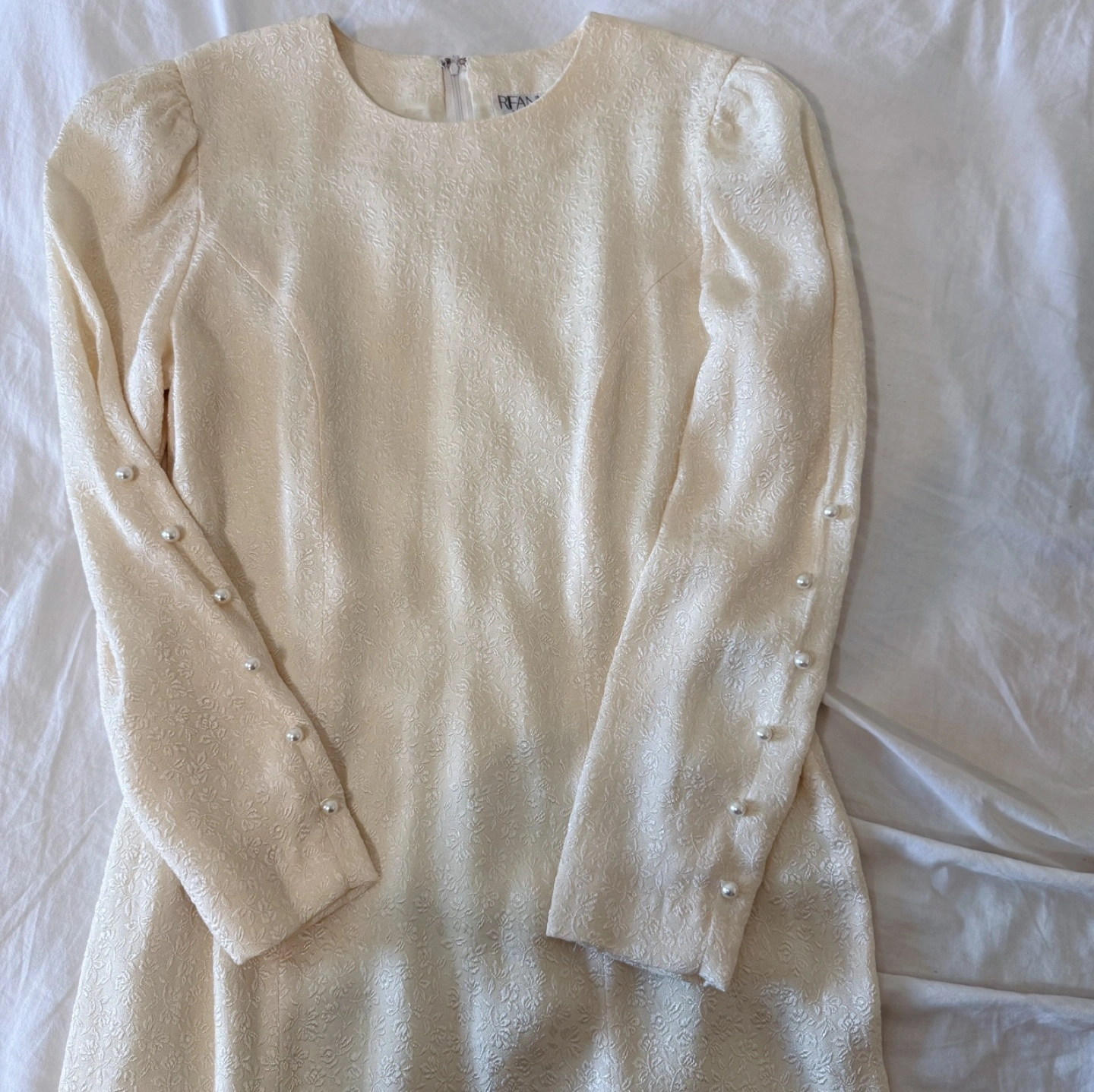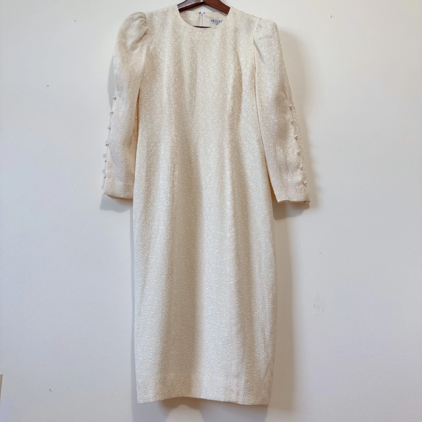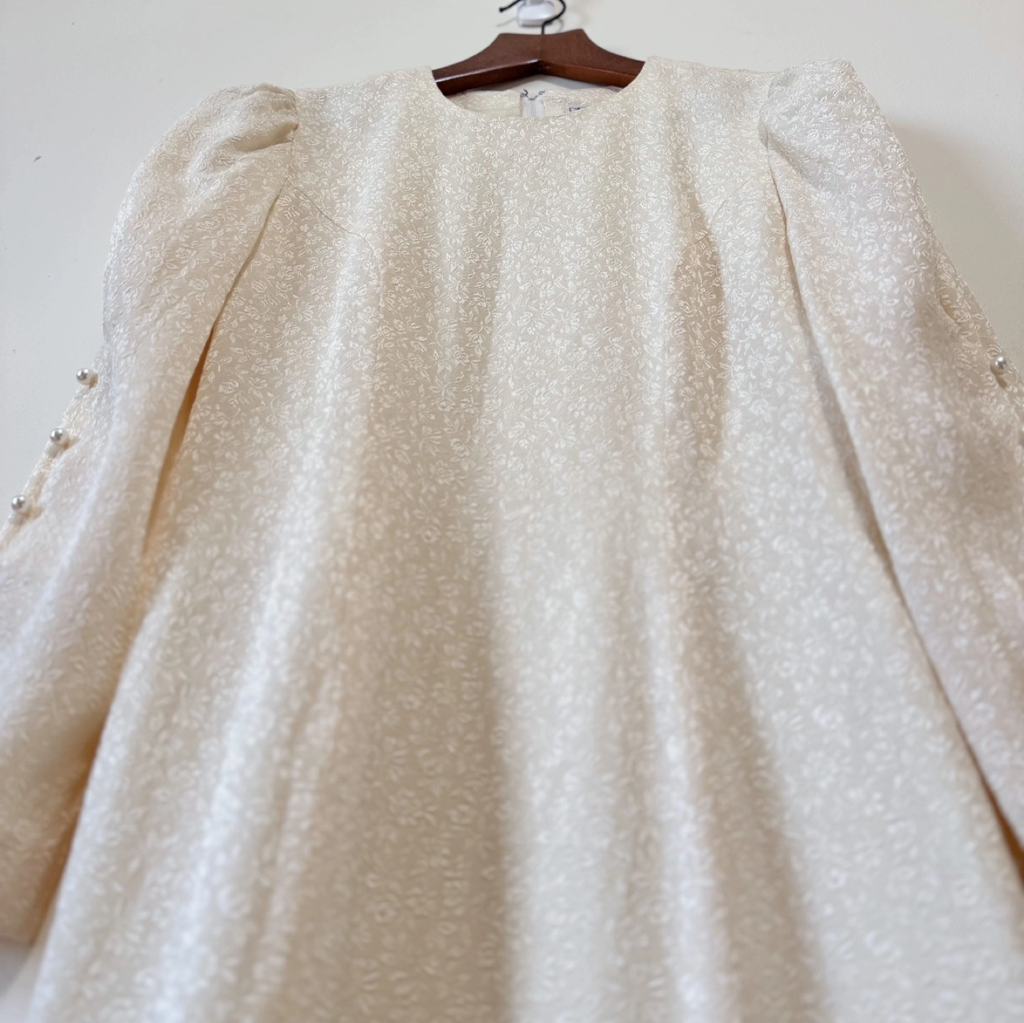A beautifully tailored vintage dress with intricate floral jacquard fabric and elegant puff sleeves. Features dainty pearl button detailing down the sleeves for a graceful finish. The streamlined silhouette and subtle texture offer timeless charm, perfect for formal events or special gatherings.