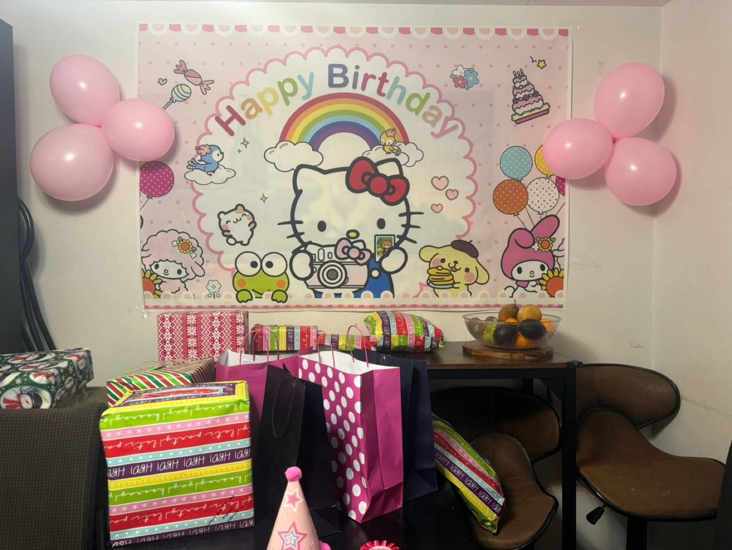 Large pink backdrop featuring Hello Kitty and other Sanrio characters. Perfect for a birthday party. Measures 110cm x 180cm. Excellent condition.