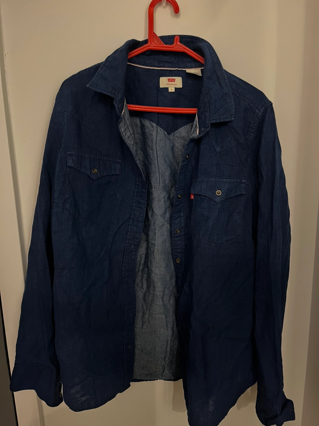Long sleeve button-up shirt. Dark blue denim. Two chest pockets.