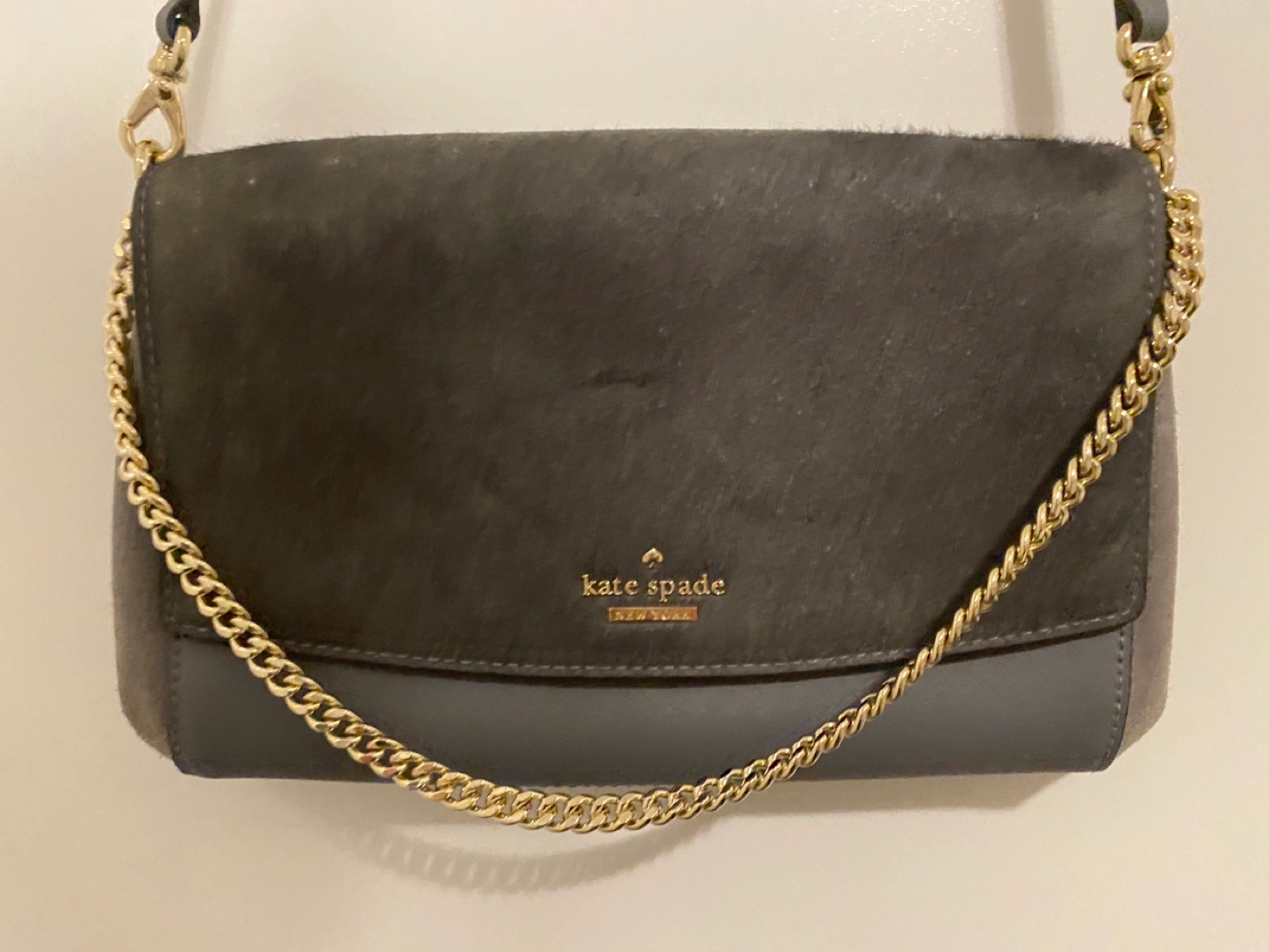 Grey crossbody bag. Features a chain and leather strap. Suede and leather construction. Gold-tone hardware. Small, compact design. Interior features a Kate Spade print.