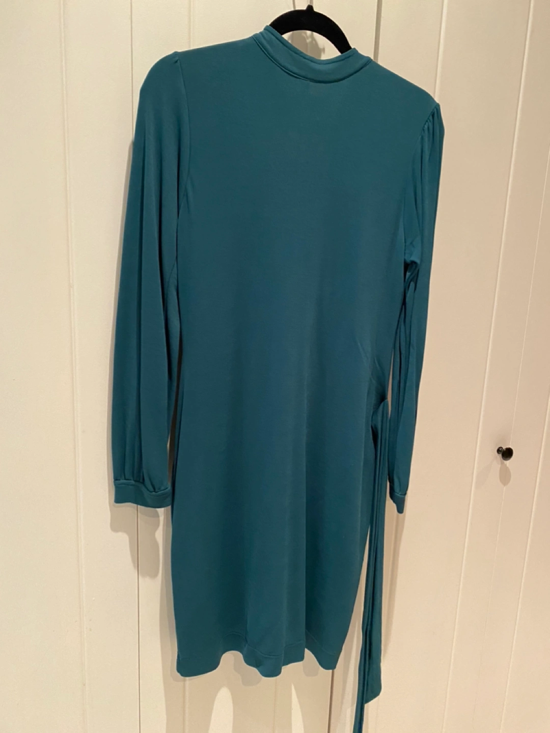 Size L. 100% polyester. V-neck with tie belt. Long-sleeves, knee length. Very flattering style.