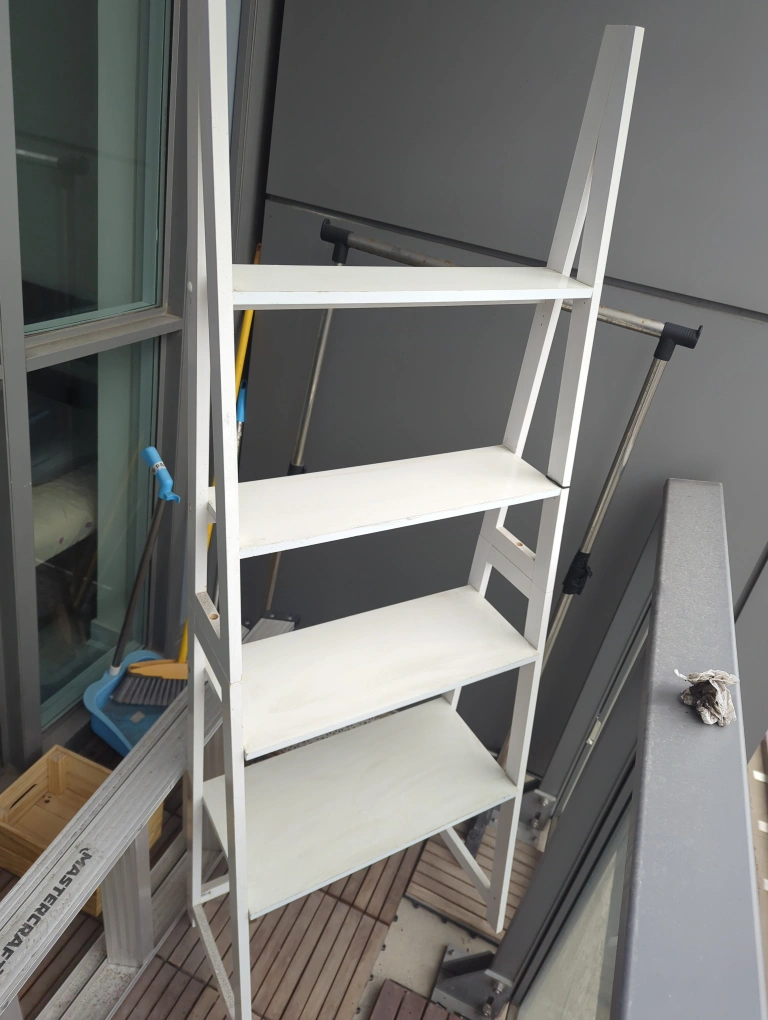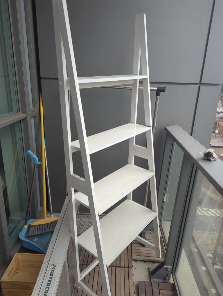 Four-shelf white ladder shelf. Good for storage or display. Sturdy construction. Minimalist design. Perfect for any room. pick up only. pick up at Distillery district