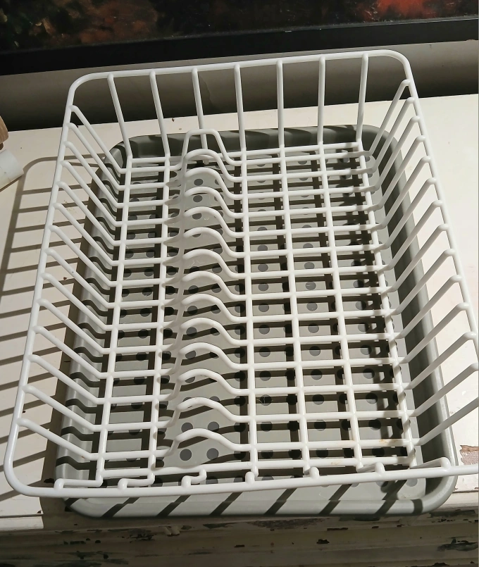 White metal dish rack, grey plastic tray. Good condition. I needed a bigger one.