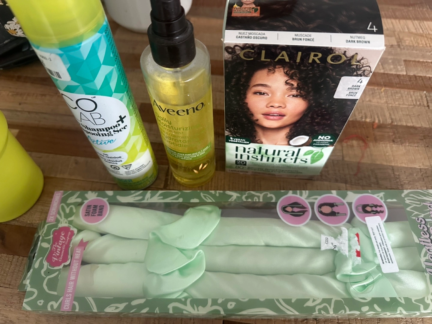 Clairol hair dye, dark brown. Aveeno Daily Moisturizing Body Oil Mist. GO AB Shampoo +Conditioning See. Set of satin foam bands for curls, unused.