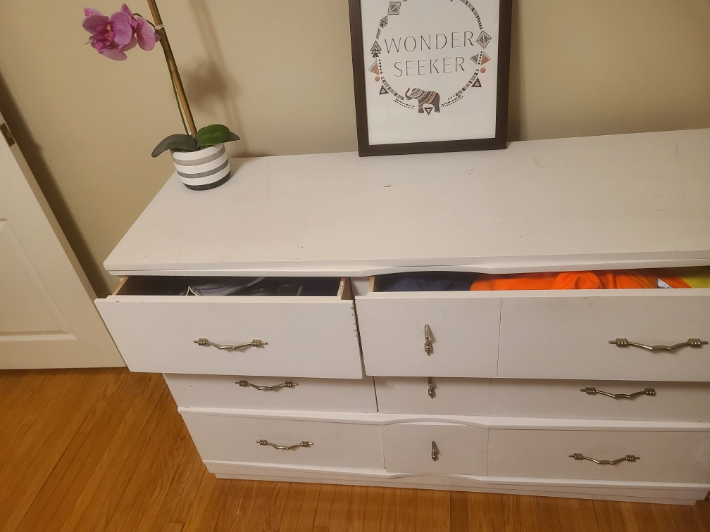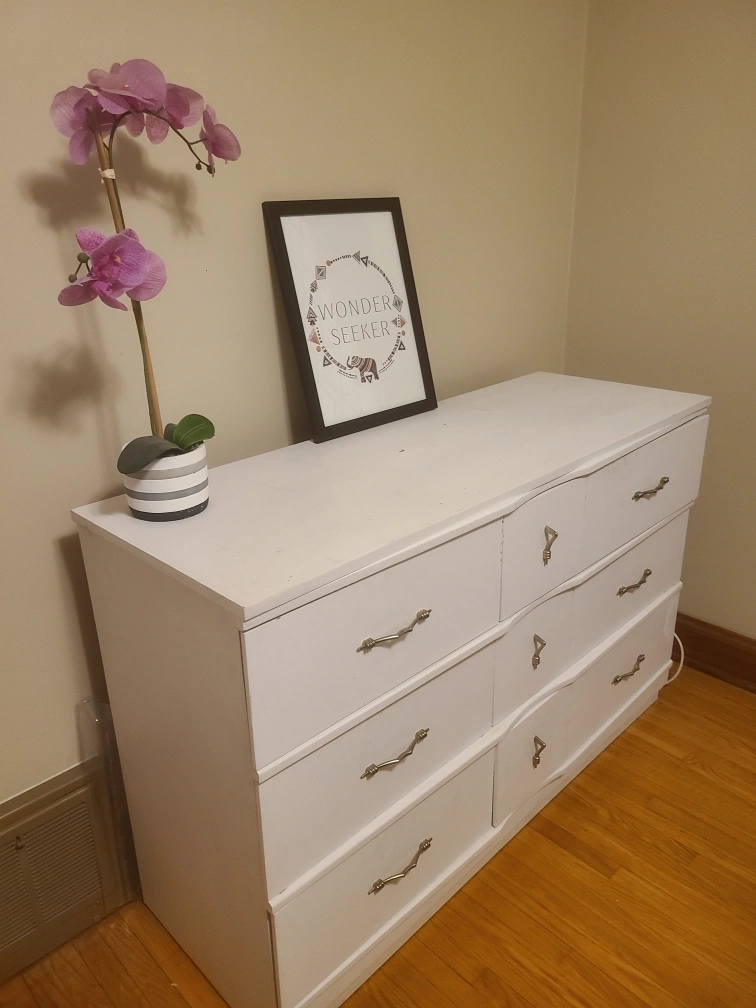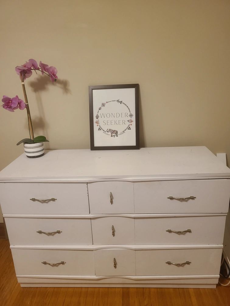73White dresser, six drawers, metal handles. Drawers working fine. Slightly worn & scruff marks. Nothing a fresh coat of paint can't fix. Lenght: 50 inches Height: 32.5 inches Width: 18 inches Pick up: South Oshawa (Major intersection Bloor & Ritson)