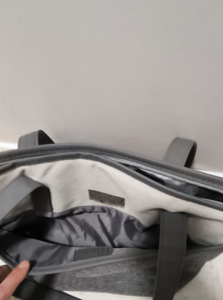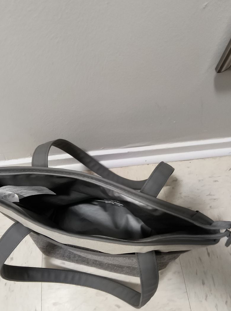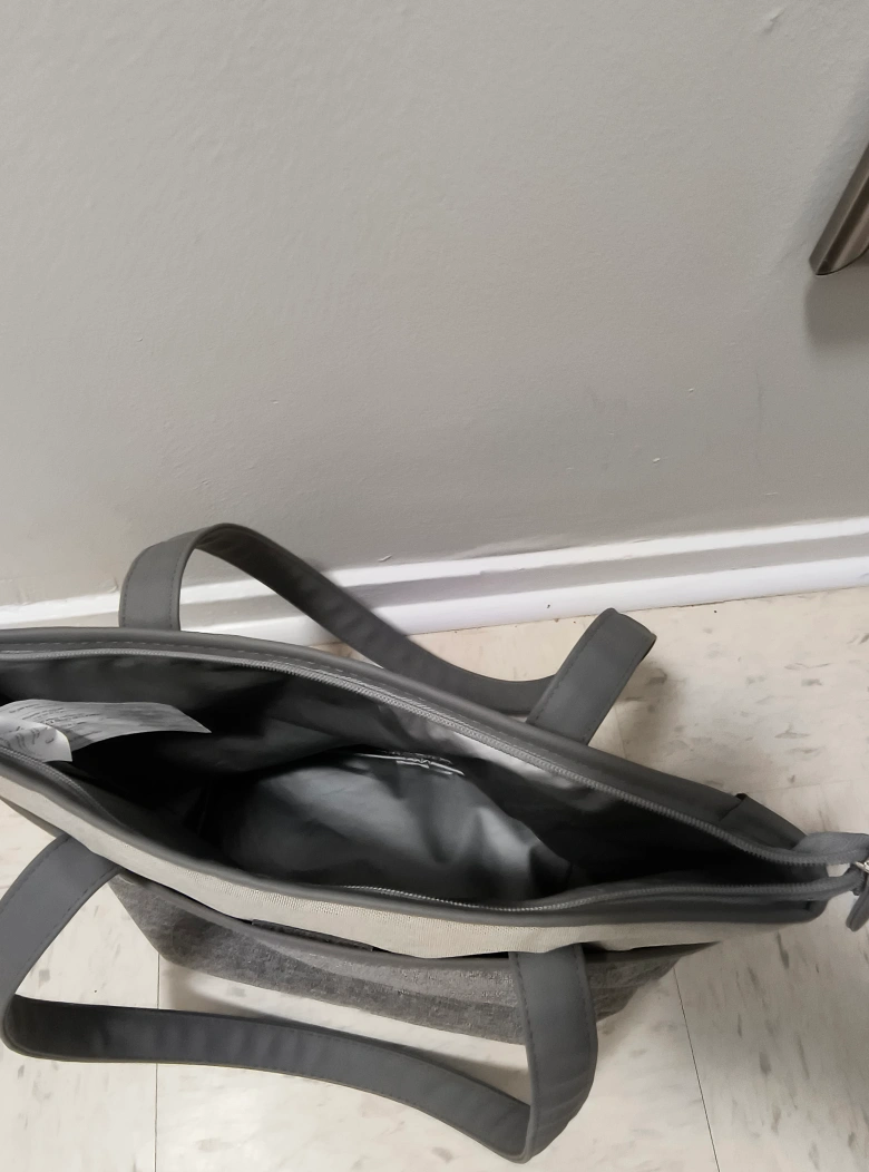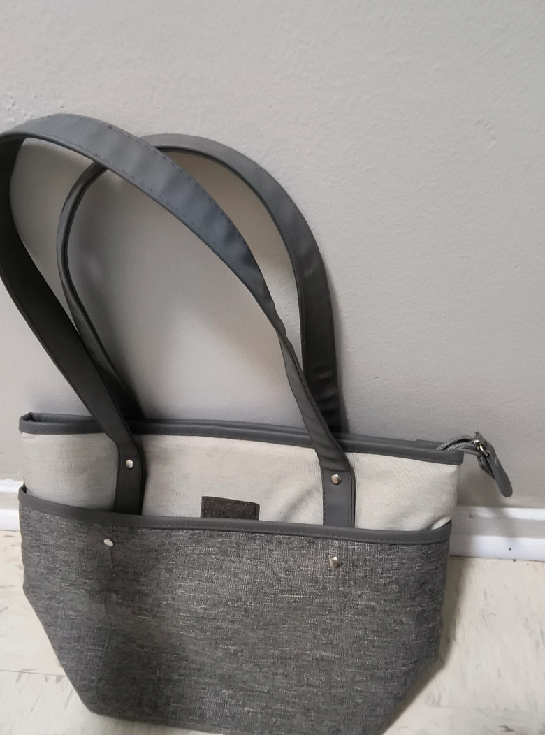 Stylish grey insulated tote bag. Features two durable handles, zipper closure, and spacious interior. Perfect for carrying groceries, lunch, or other items.