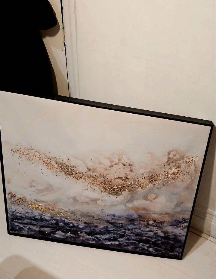 Beautiful large abstract canvas wall art. Neutral colours with gold accents. Features a modern design. Black frame. Ready to hang.