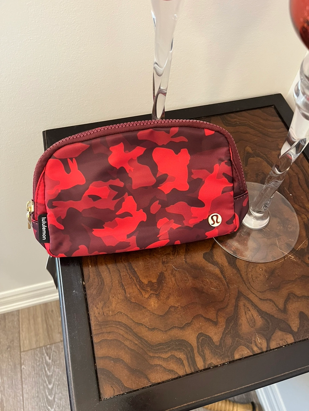Small red camouflage waist pack. Adjustable strap. Zipper closure. Perfect for carrying essentials.