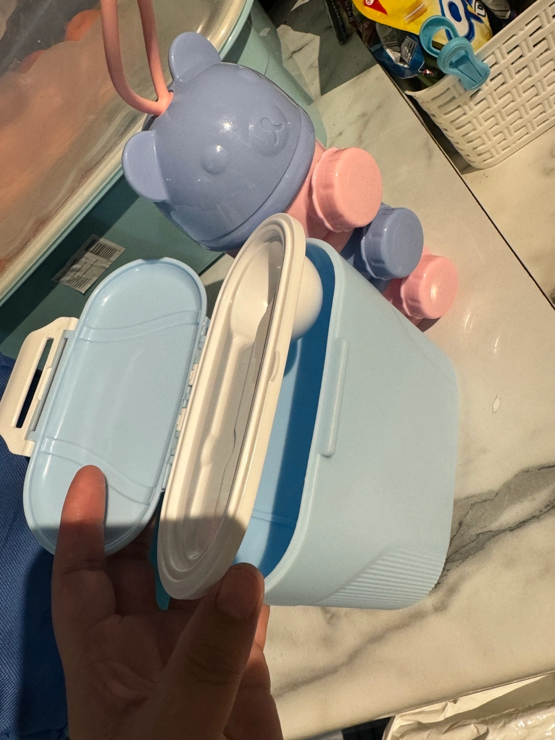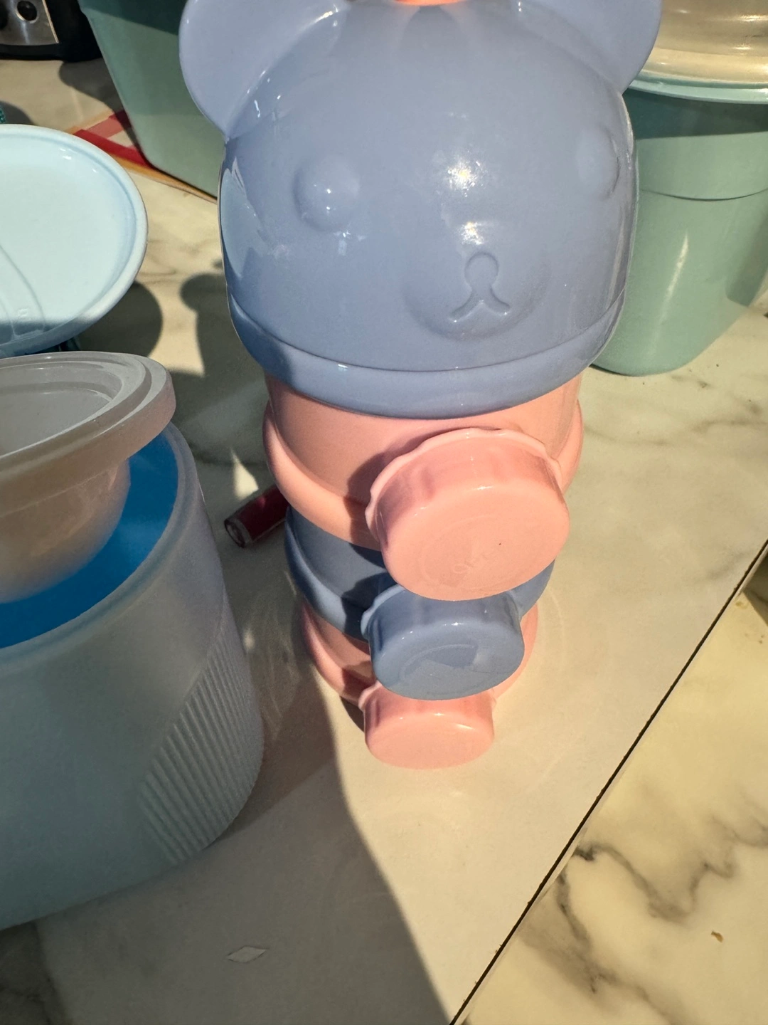 Cute and convenient three-section formula dispenser. Perfect for travelling with your baby. Includes a separate container for a scoop. Pastel blue and pink colours. Stackable sections with individual lids.