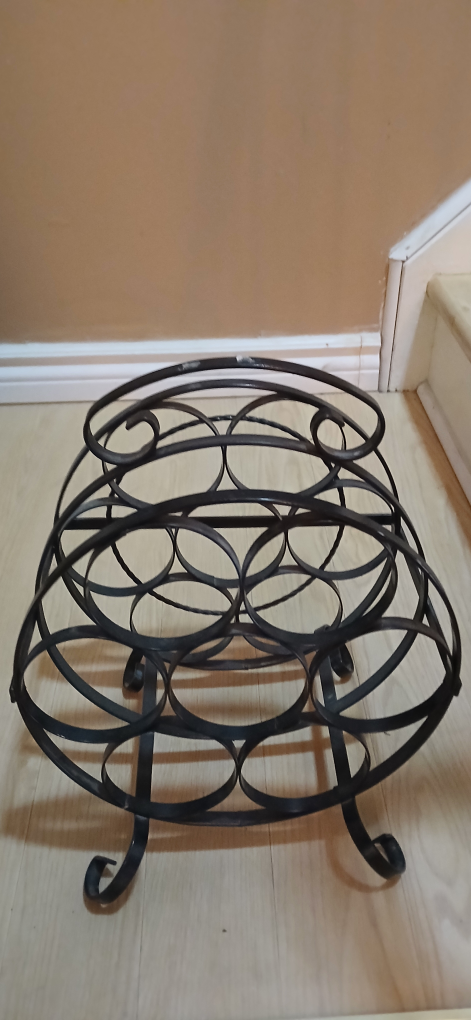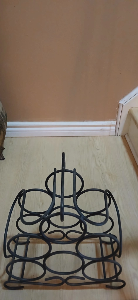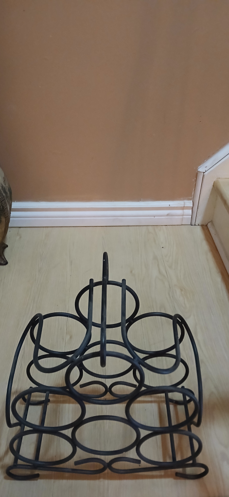 Black metal wine rack. Holds approximately six bottles. Ornate design. Free-standing. 2 for $5