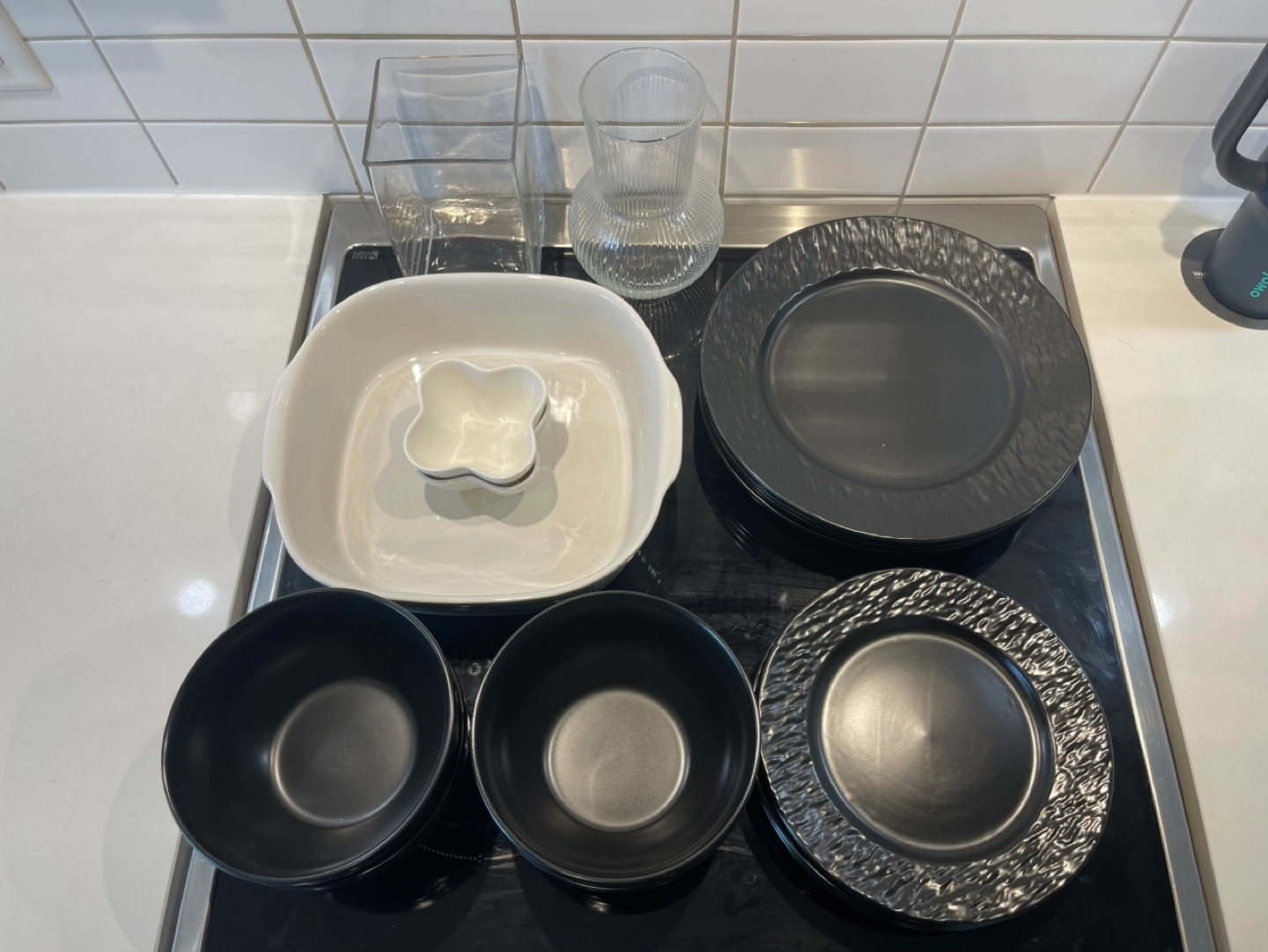 Modern kitchenware bundle. Includes black bowls and plates, a white baking dish with small bowls, and clear glass vases. Perfect for everyday use or entertaining.