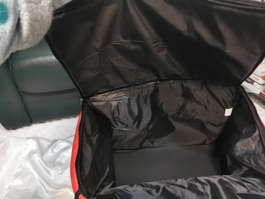 Large red insulated delivery bag. Black interior. Two carry handles. Great for food delivery or keeping items cool.