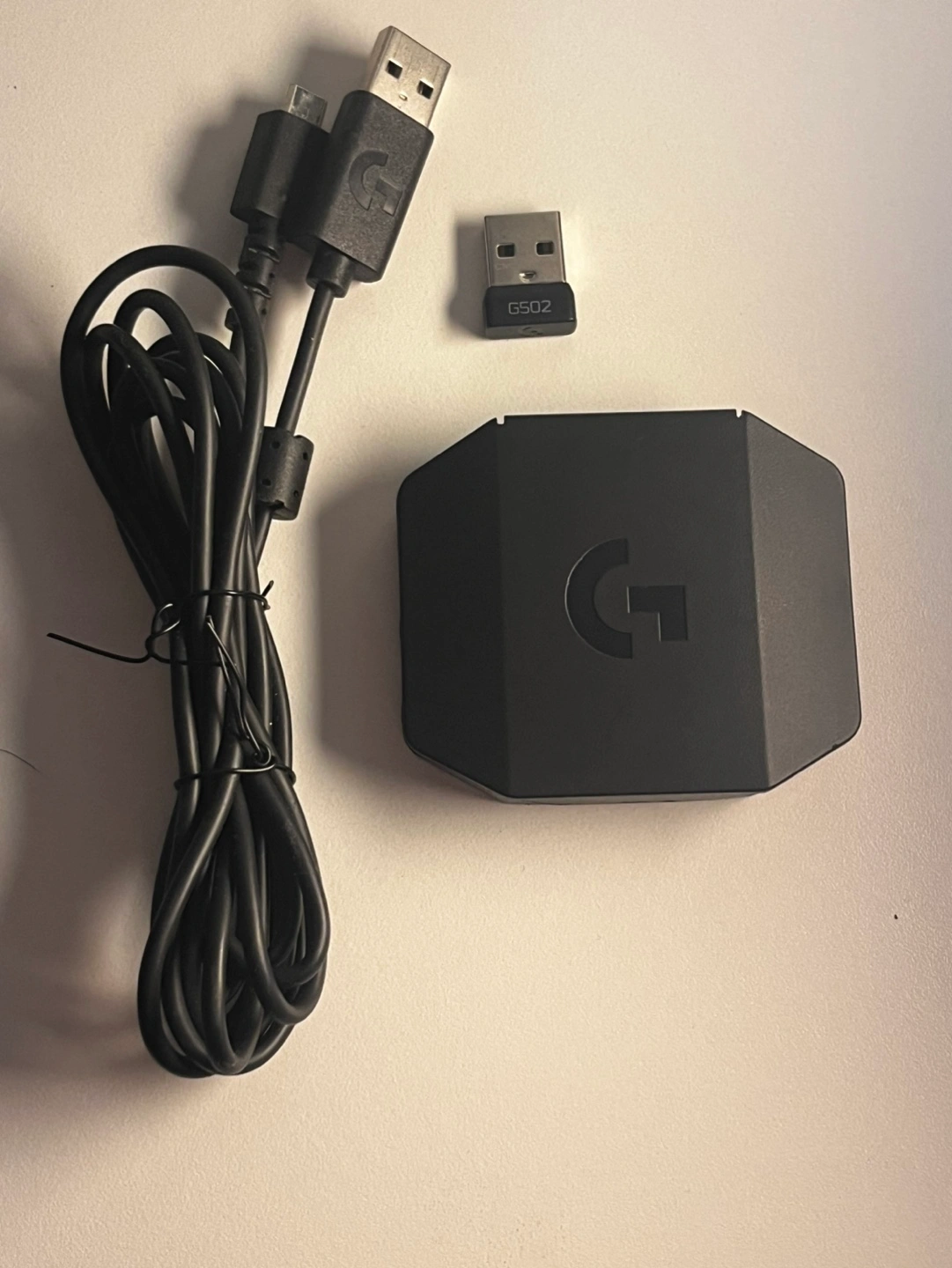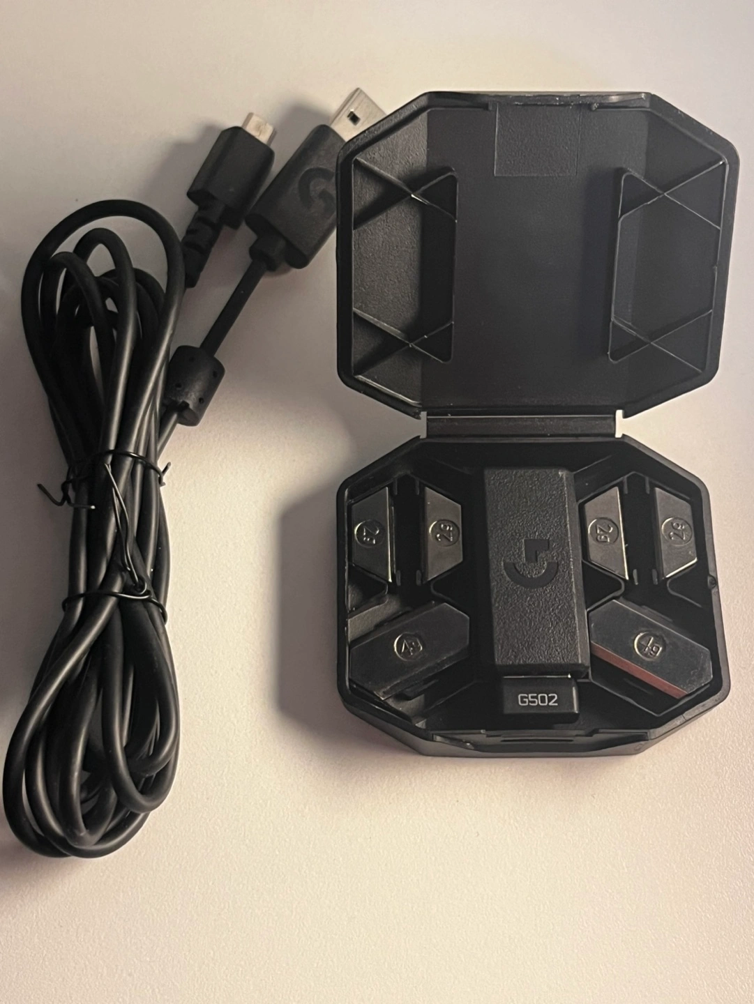 Includes G502 Wireless Mouse, weights for mouse, and cable for charging/wired use.