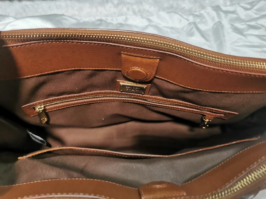 Gorgeous brown leather tote bag. Double zipper closure. Top handles and detachable shoulder strap. Interior pockets. Spacious main compartment. Excellent for everyday use.