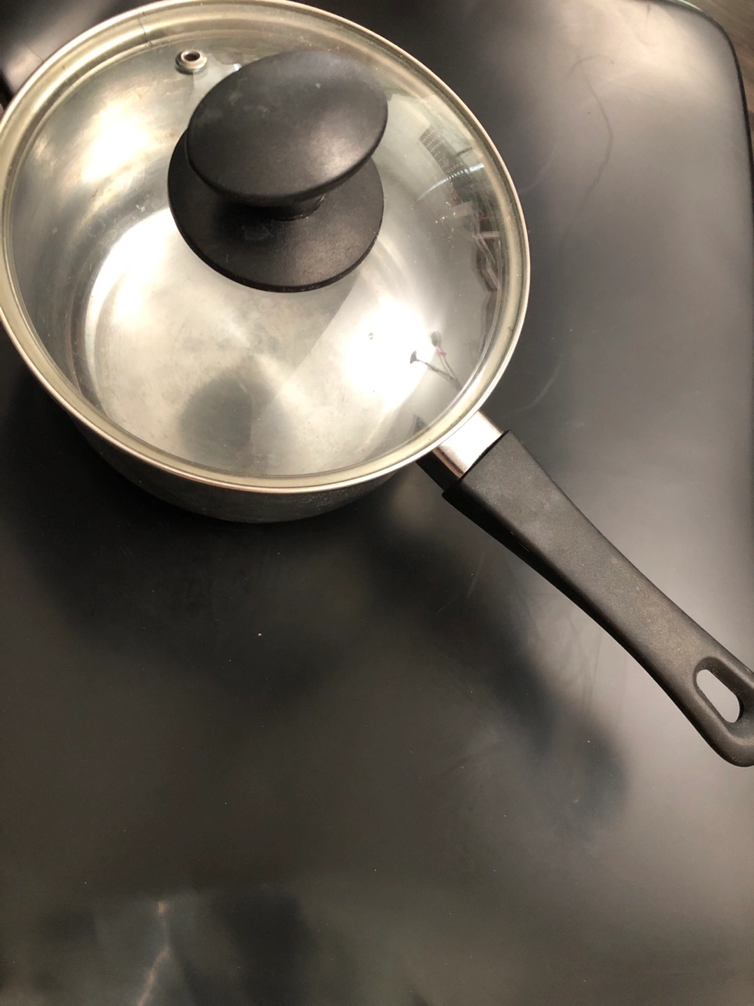 Features a black, comfortable handle and a clear glass lid with a black knob. Ideal for cooking small portions or sauces.