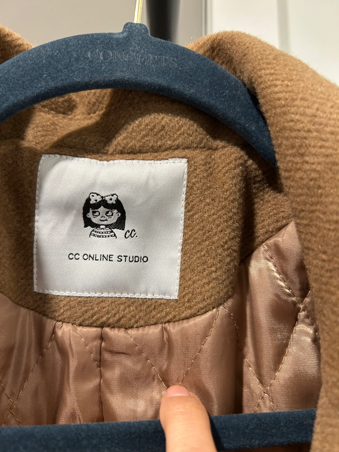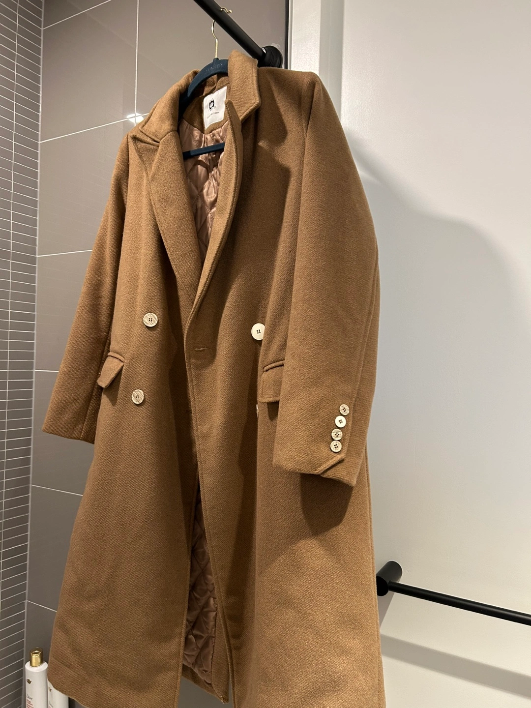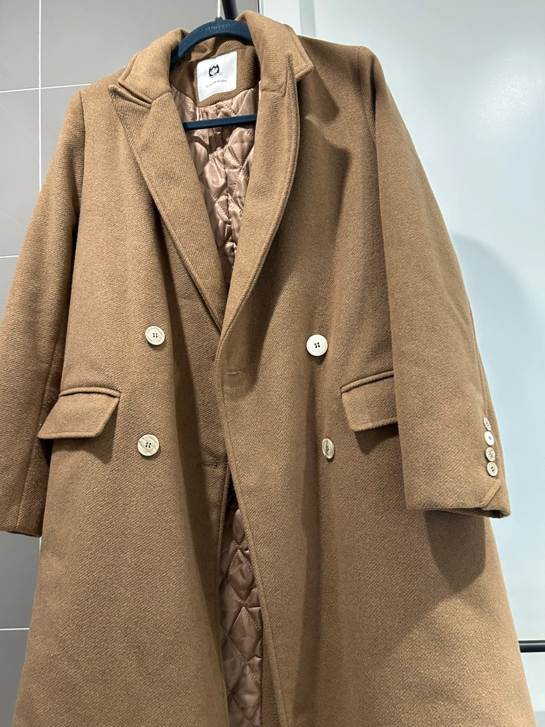 Warm camel-coloured wool coat. Double-breasted, longline style. Features gold buttons and a quilted lining. Excellent condition.