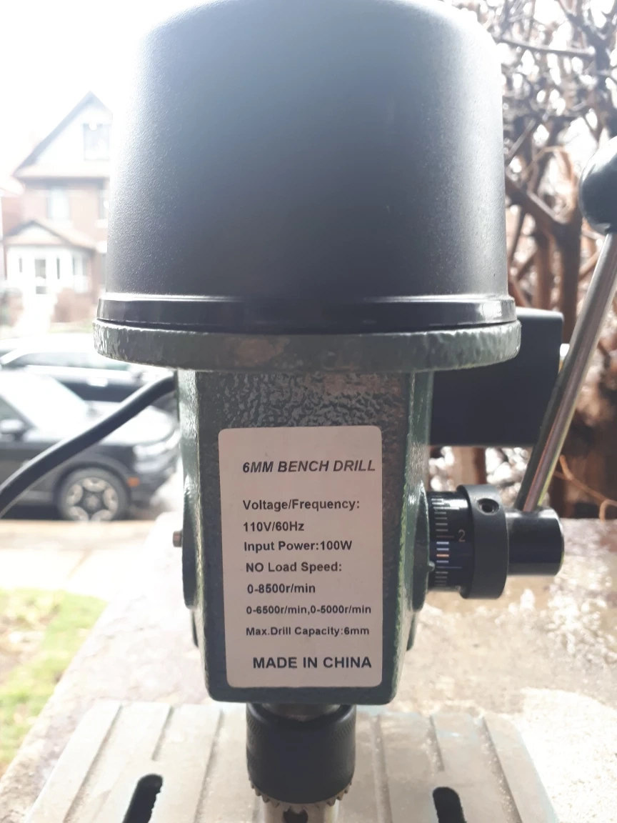 6mm bench drill press. 110V/60Hz. 100W input power. 0-8500r/min no load speed. 0-6500r/min max speed. Made in China. Includes base.