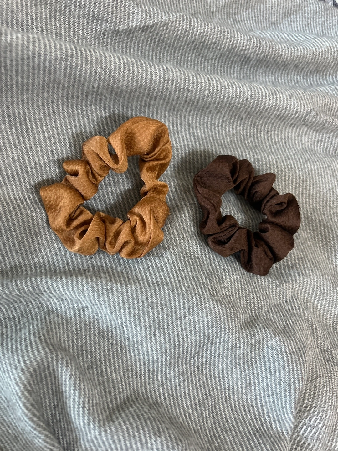 213Set of two fabric scrunchies. One brown and one tan. Soft and stretchy. Can be sold individually. Price shown is for the pair.