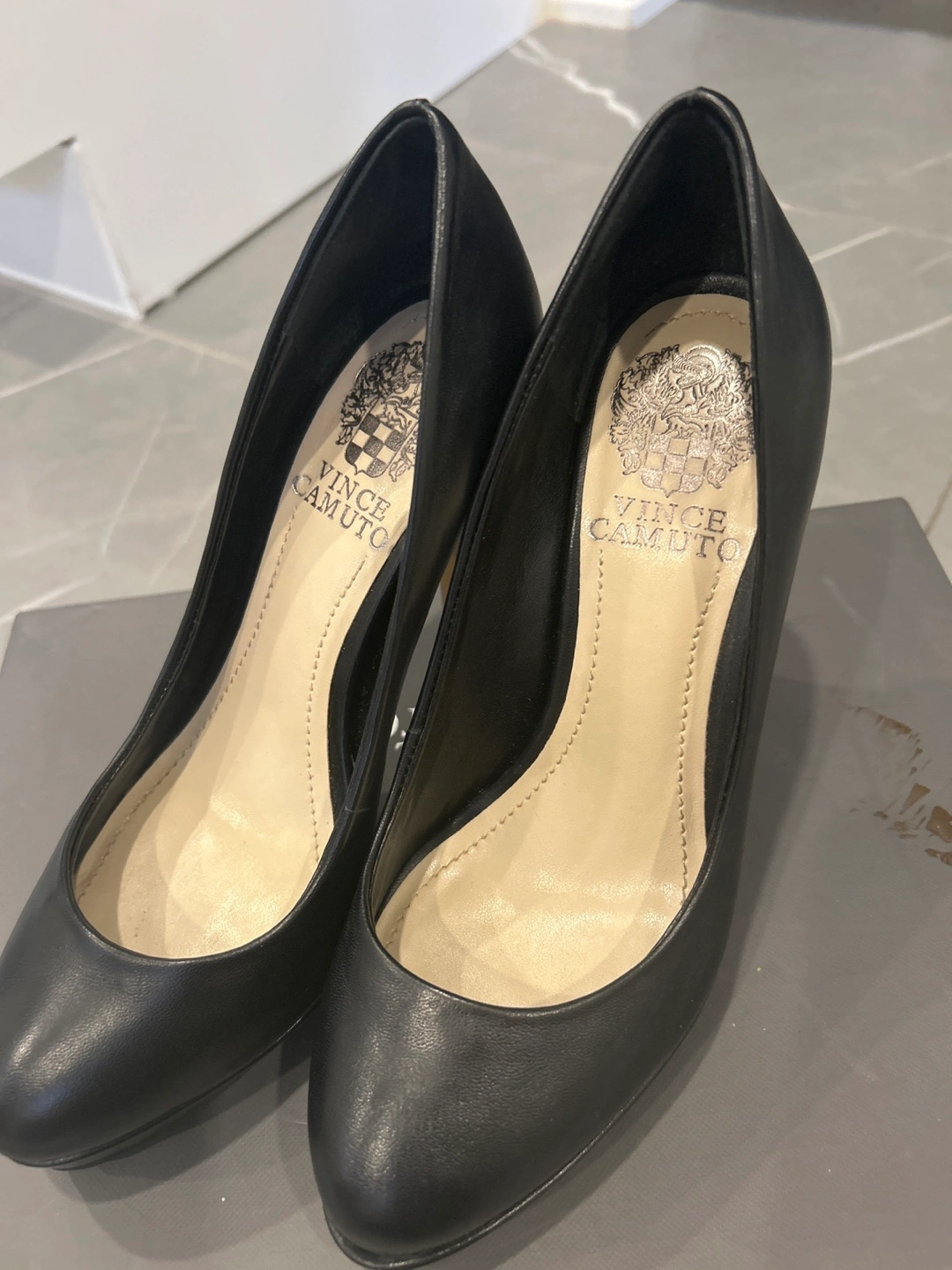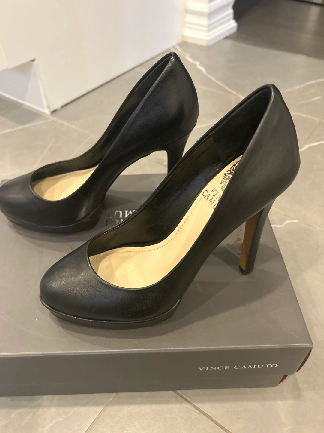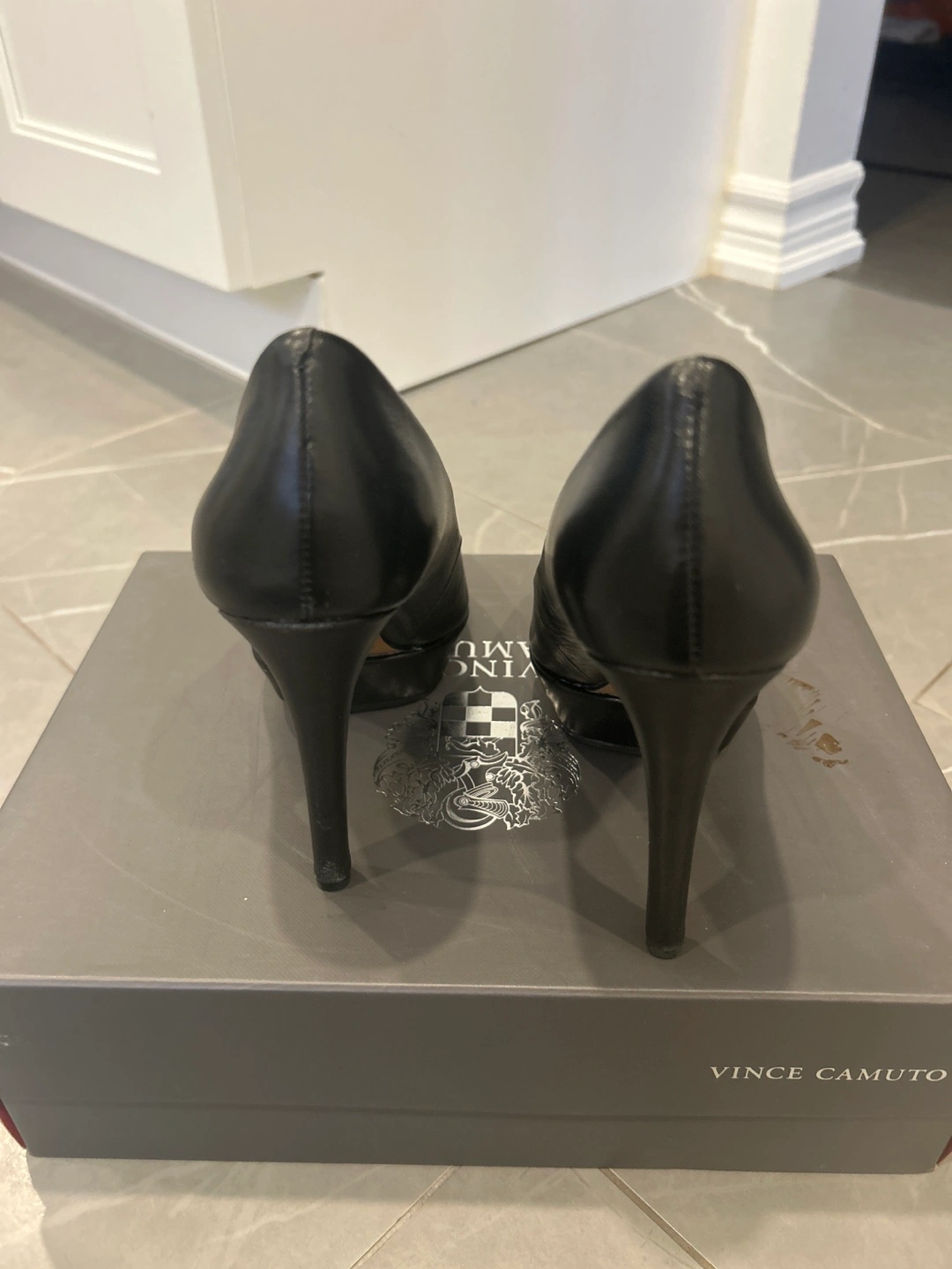 Black leather platform heels. Classic style, elegant design. Excellent condition. Comes in original box.