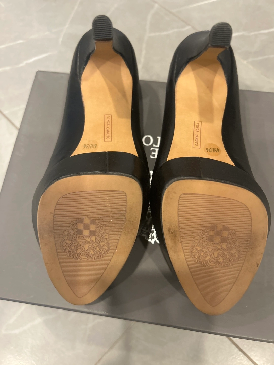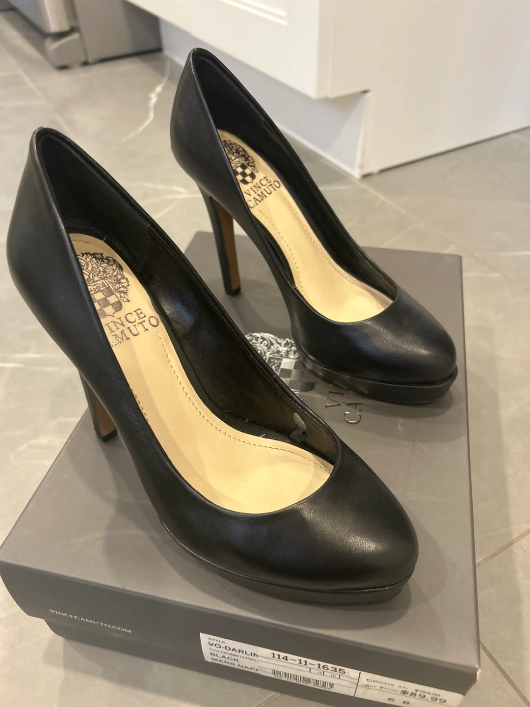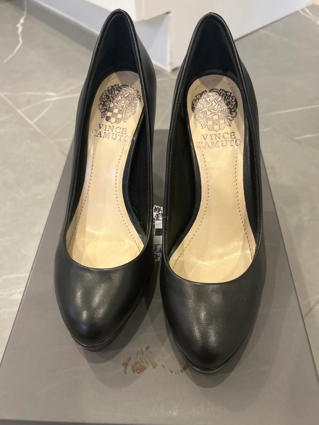 Black leather platform heels. Classic style, elegant design. Excellent condition. Comes in original box.