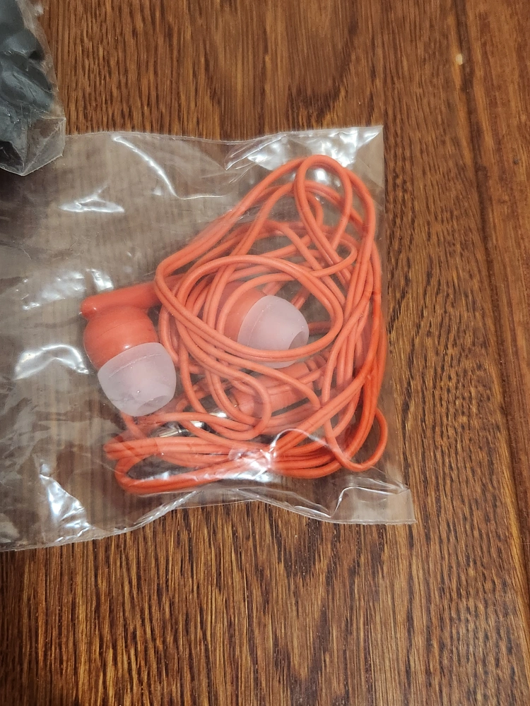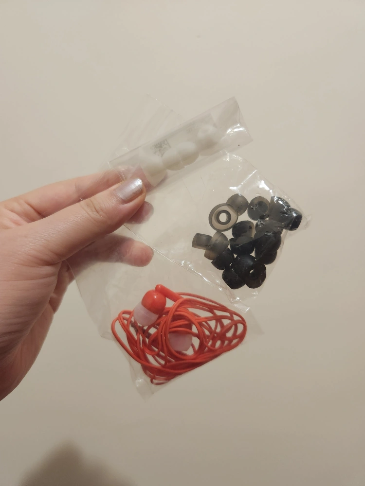 Red wired earphones and extra earbud tips in black, grey, white, unused in various sizes. Great for replacements or backups.