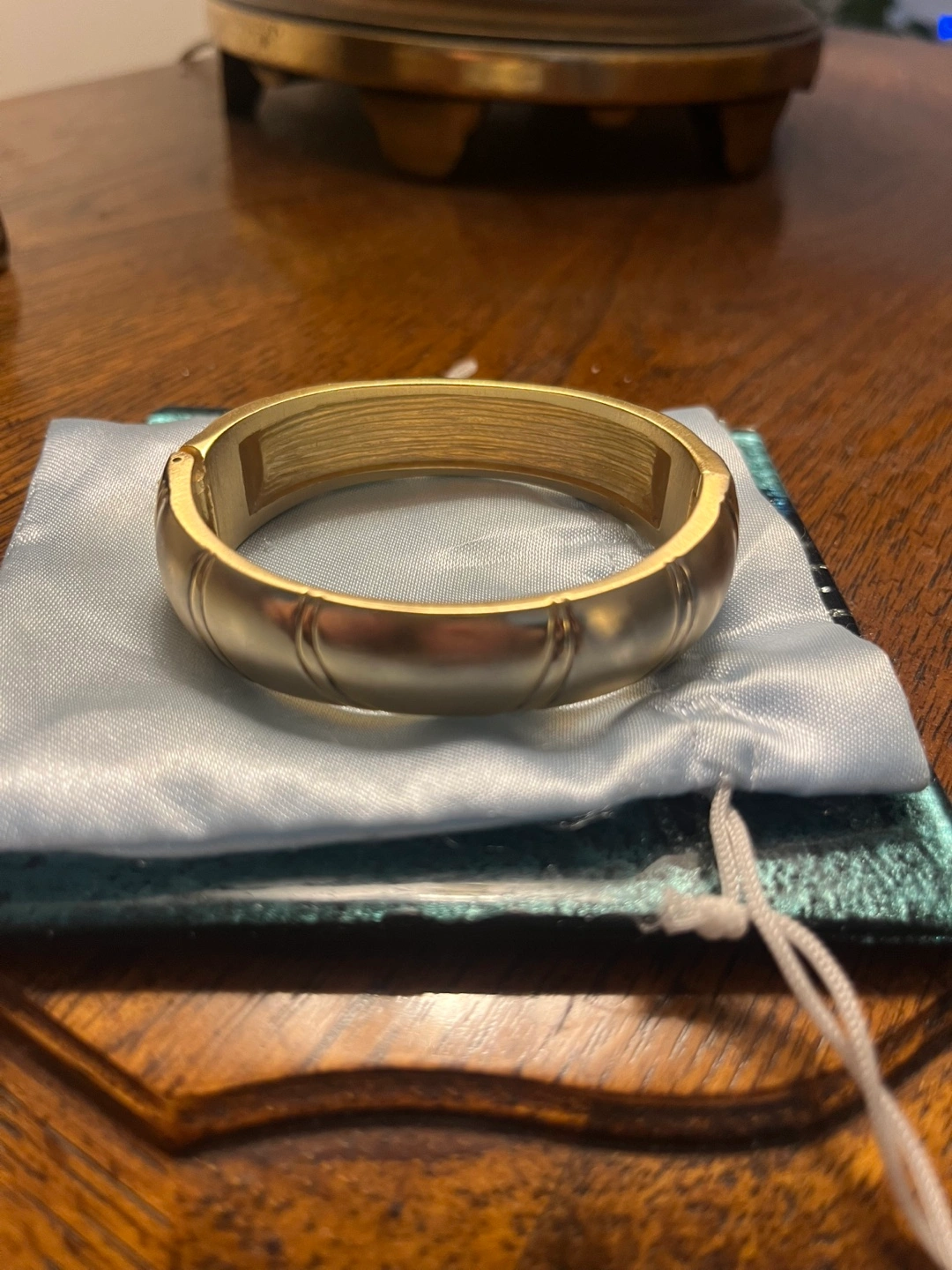 Elegant small gold-tone hinged bangle bracelet. Features subtle grooves. 2.25” x 2” (small fit). Never been worn.