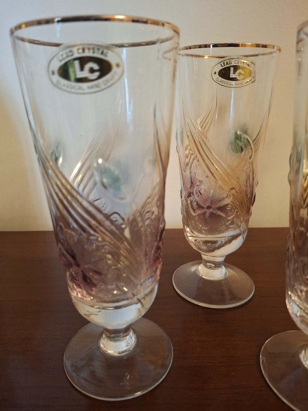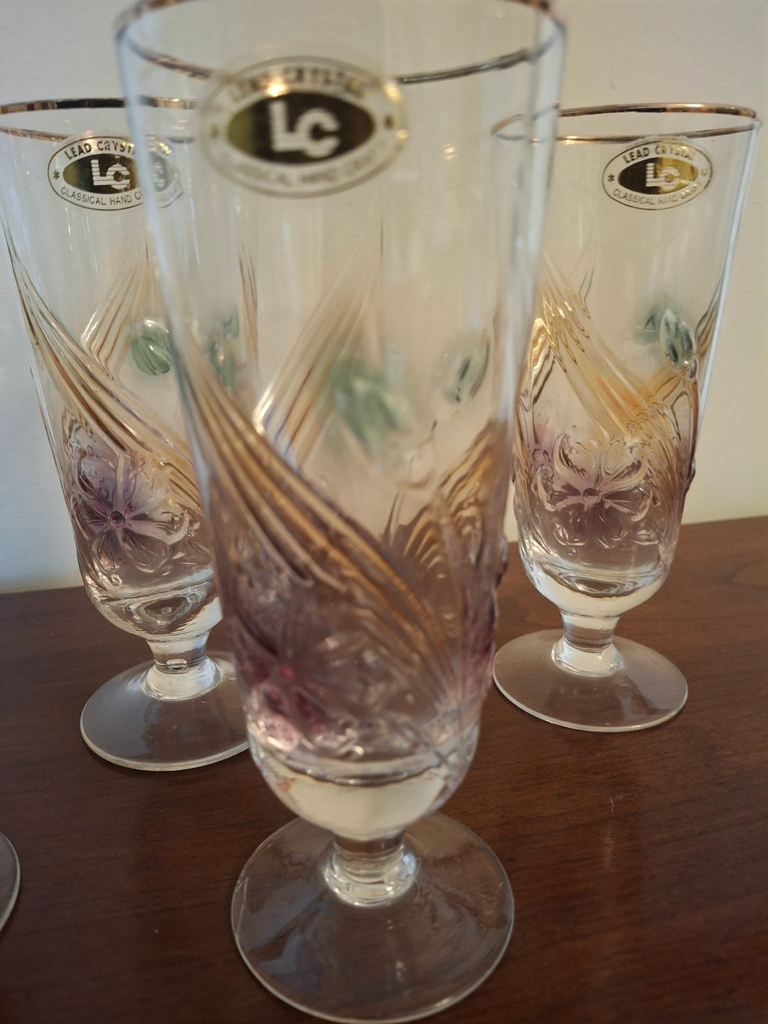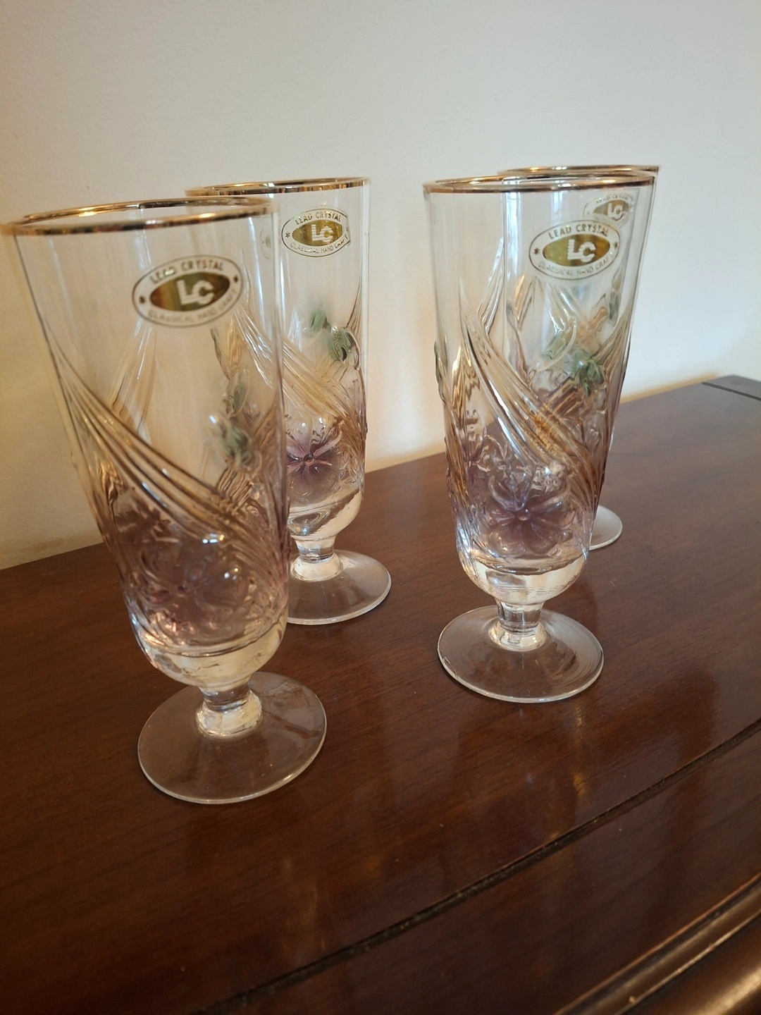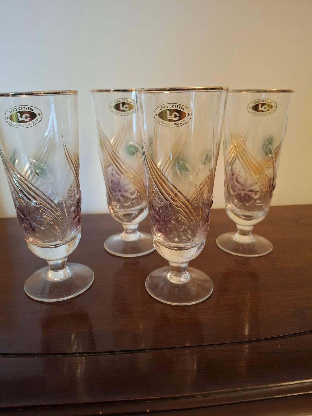 Four beautiful lead crystal glasses. Elegant design, hand cut detailing. Gold-rimmed top. Purple and green floral accents. Excellent condition. 6โ tall, never been used. Price is for the set. Available for pickup in Markland Wood.