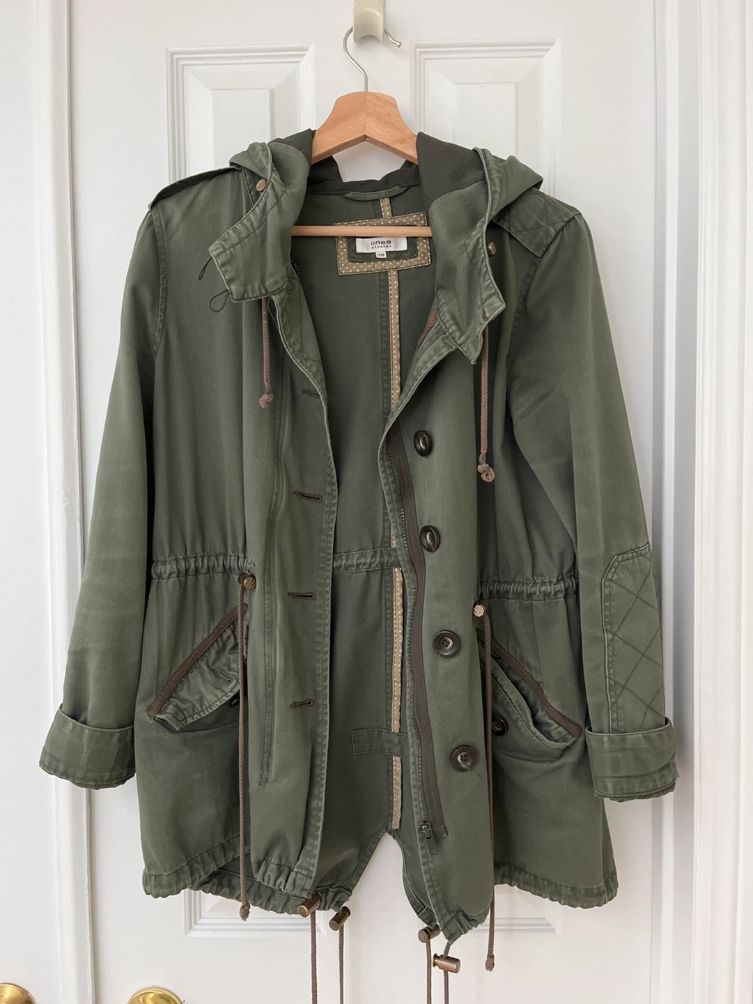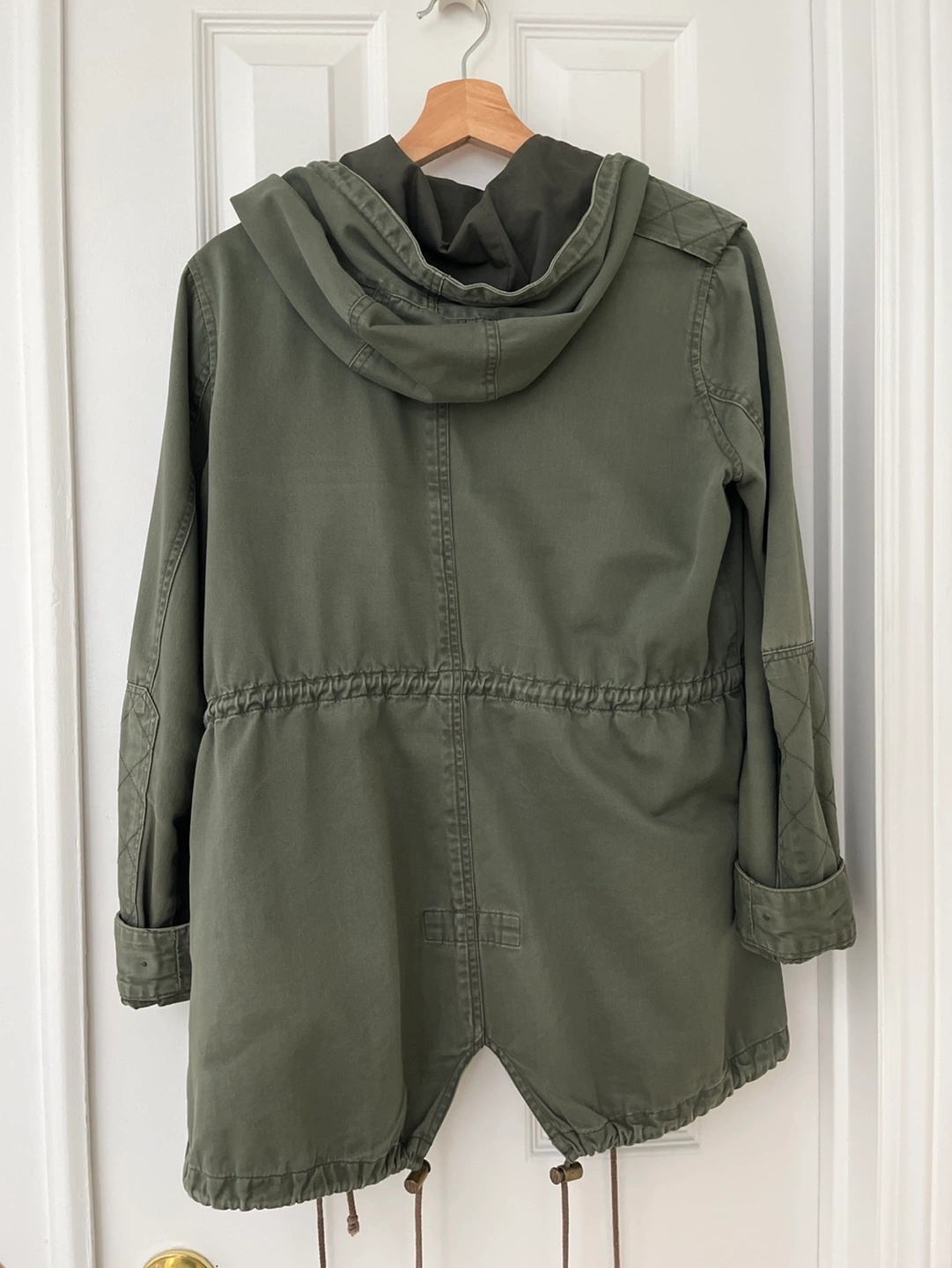 Olive green hooded spring jacket. Features a drawstring waist, button closure, and quilted shoulder patches. Long sleeves. Drawstrings at the bottom hem.