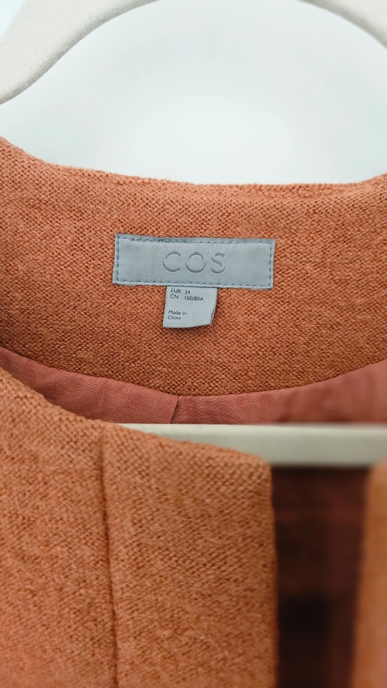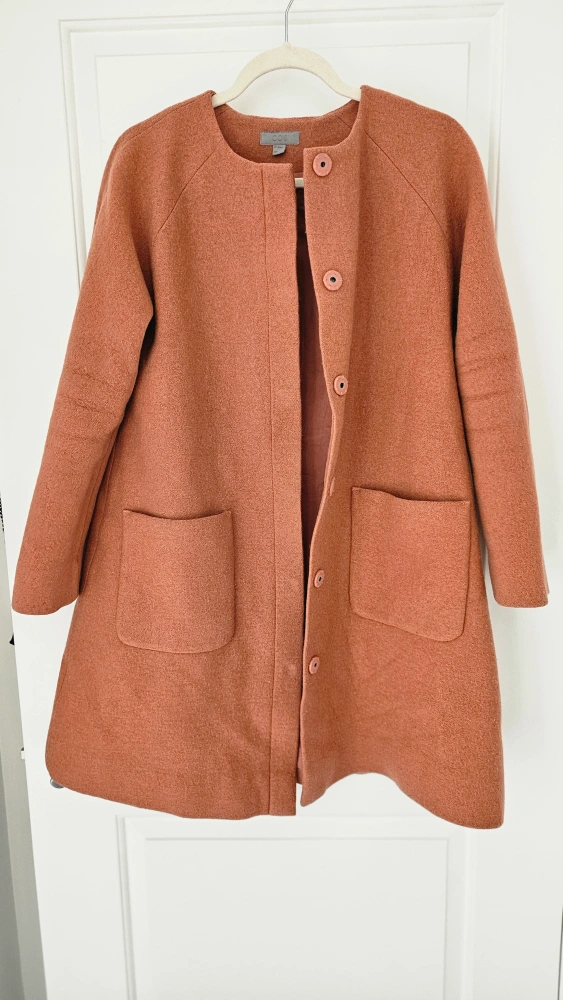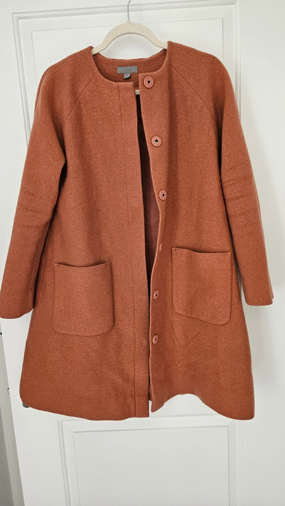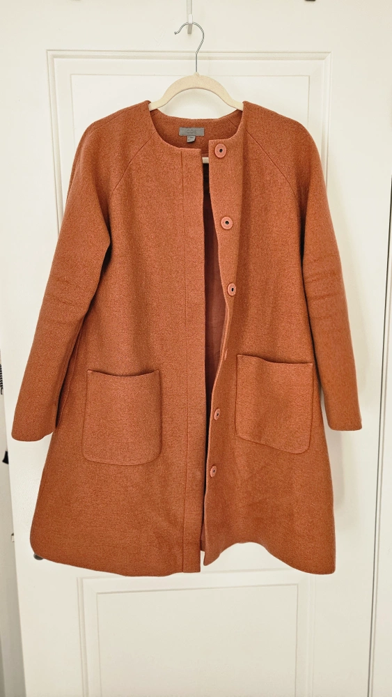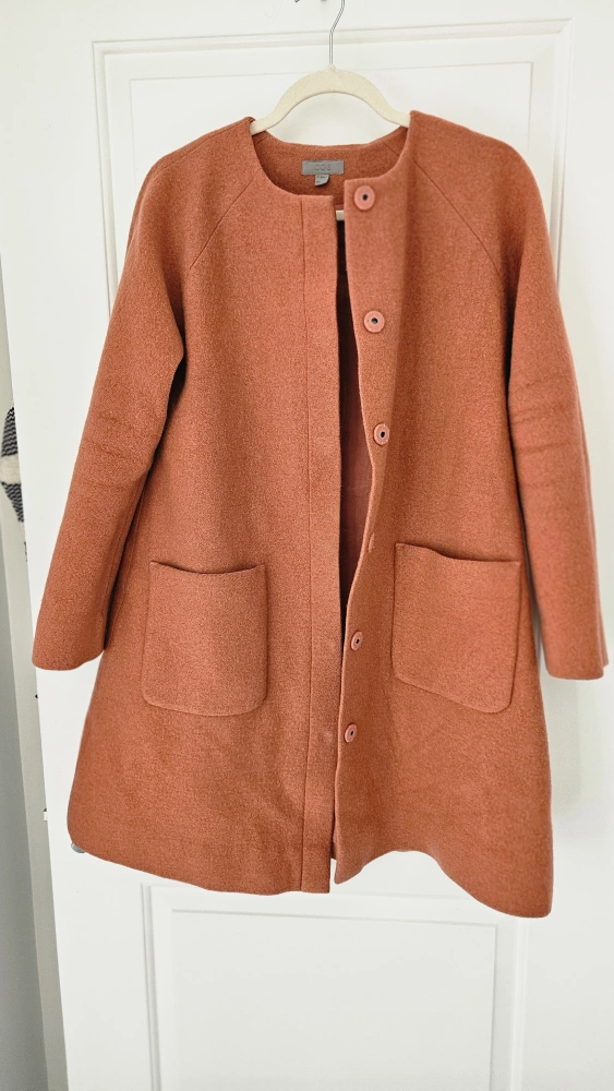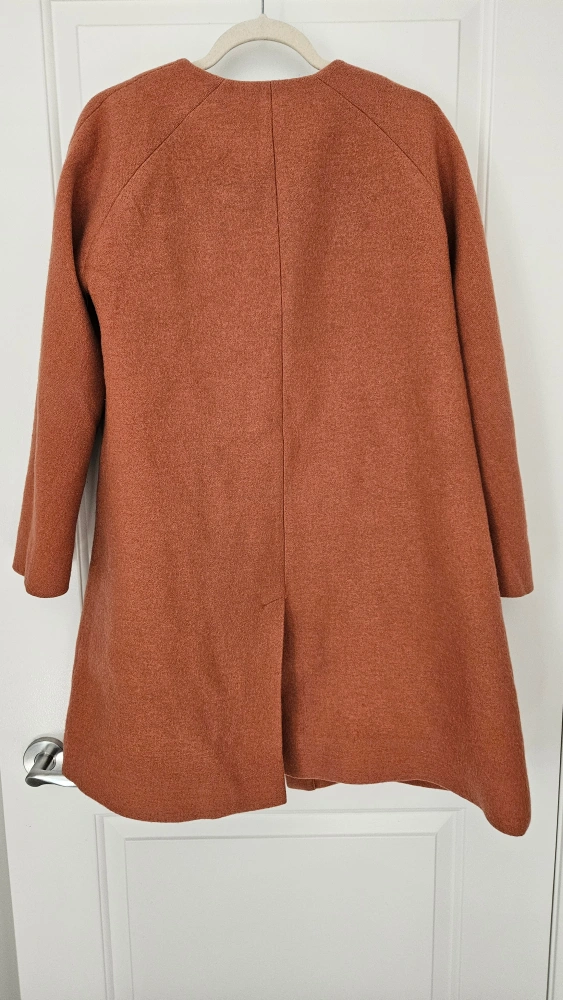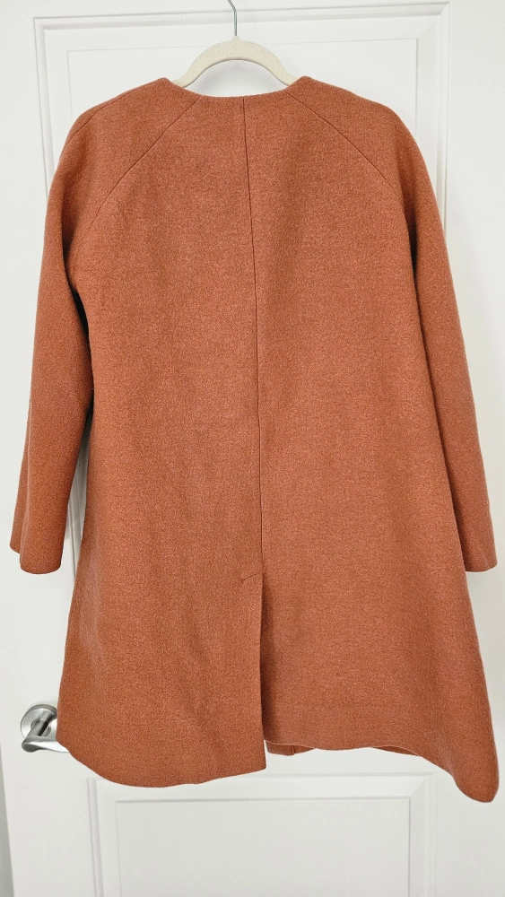 Beautiful rust-coloured wool coat. Features a relaxed fit, long sleeves, and two patch pockets. Button closure. Size small-medium