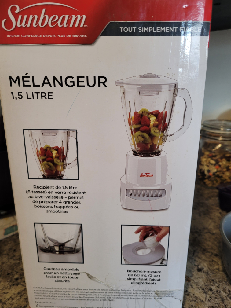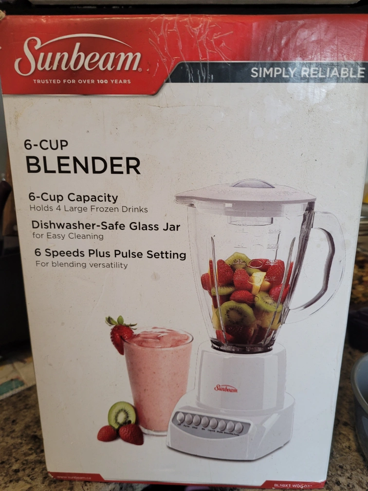 Sunbeam 6-cup blender. Six speeds plus pulse setting. Dishwasher-safe glass jar. Holds four large frozen drinks. Box opened but not used